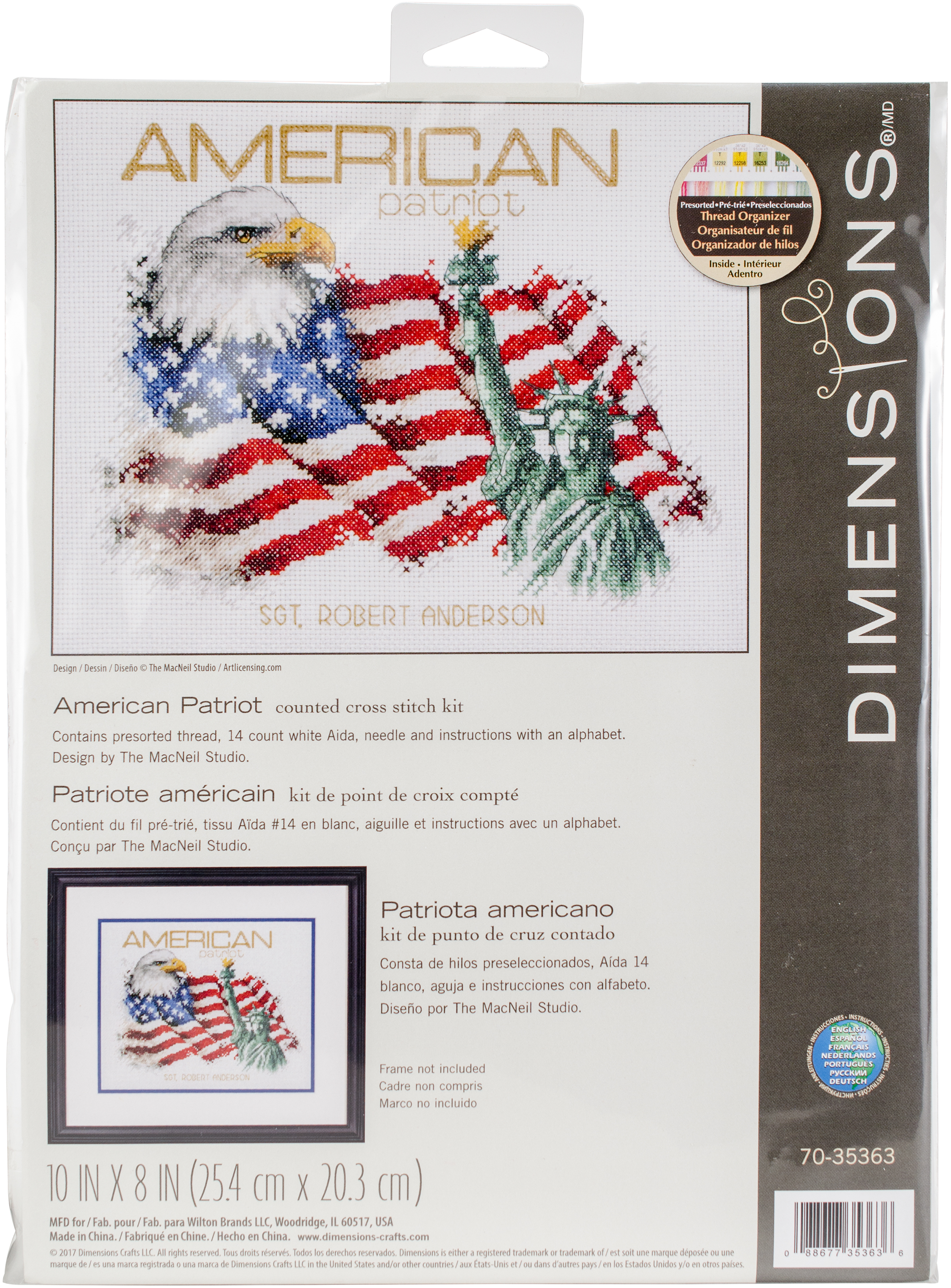 From elegant to whimsical, landscapes to still-life's, realistic to fantasy, no matter your style Dimensions has a fabulous needle-craft kit for you. This package contains 14-count Aida, cotton thread, thread sorter, needle and easy to follow instructions. Finished size: 10x8 inches. Design: American Patriot. Imported.