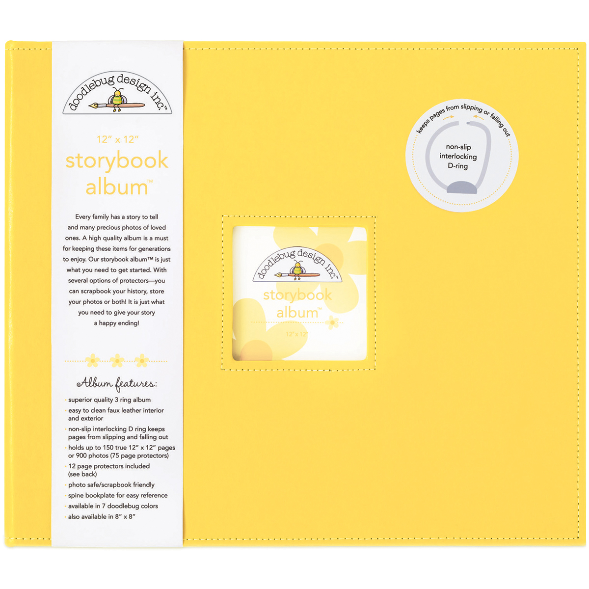 DOODLEBUG-Storybook Album. This package contains one 3-ring album with a 3-1/2x3-1/2in photo window in the front cover and 12 page protectors (ten true 12x12 inch pockets, one photo-recipe card protector with 6 pockets and one combo protector with 4 pockets). Albums are available in a variety of designs. Albums measure 13x15x3 inches. Imported.