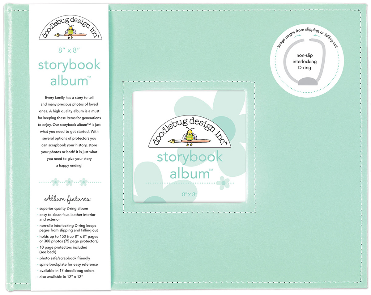 DOODLEBUG-Storybook Album. This package contains one 3-ring album with a 3-1/2x3-1/2in photo window on the front cover and 12 page protectors (eleven 8x8 inch pockets and one photo-recipe card protector with 3 pockets of various sizes). Albums are available in a variety of designs. Albums measure 8-3/4x11x2-1/2 inches. Imported.