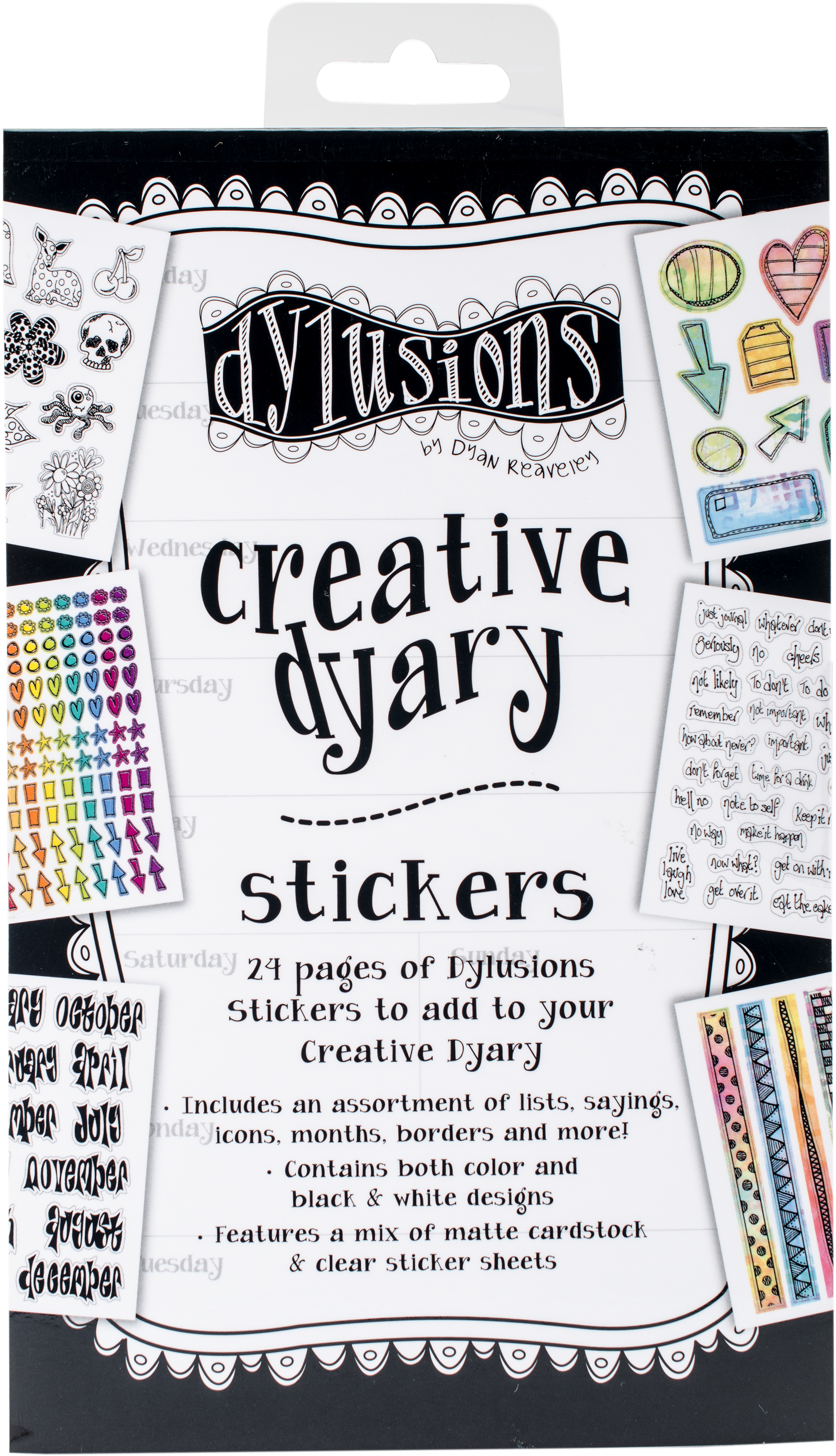 Creative Dyary Stickers include twenty-four pages of matte and clear sticker sheets. Each assorted page includes color images or black and white designs perfect for coloring in. Dylusions stickers include borders, lists, notes, bullets, tapes, sayings and shapes. Imported.