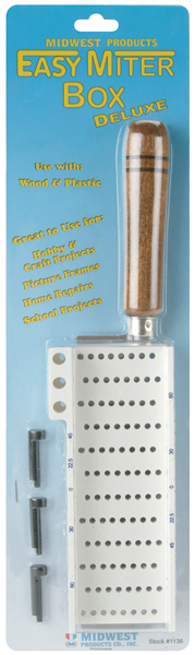 MIDWEST PRODUCTS-Deluxe Easy Miter Box. Features include: injection molded Miter box with four miter angles (22.5, 30, 45, 60 and 90 degree cut), three Cam Clamps securely hold material in place while cutting, Designed to cut material up to 1/2in thick and as wide as 2in, includes Zona Razor Saw with 32 teeth per inch for finer cuts and thin 0.010in blade. Use with wood and plastic. Great for use for hobby and craft projects, picture frames, home repairs and school projects. Box measures 6x2-5/8in. Imported.