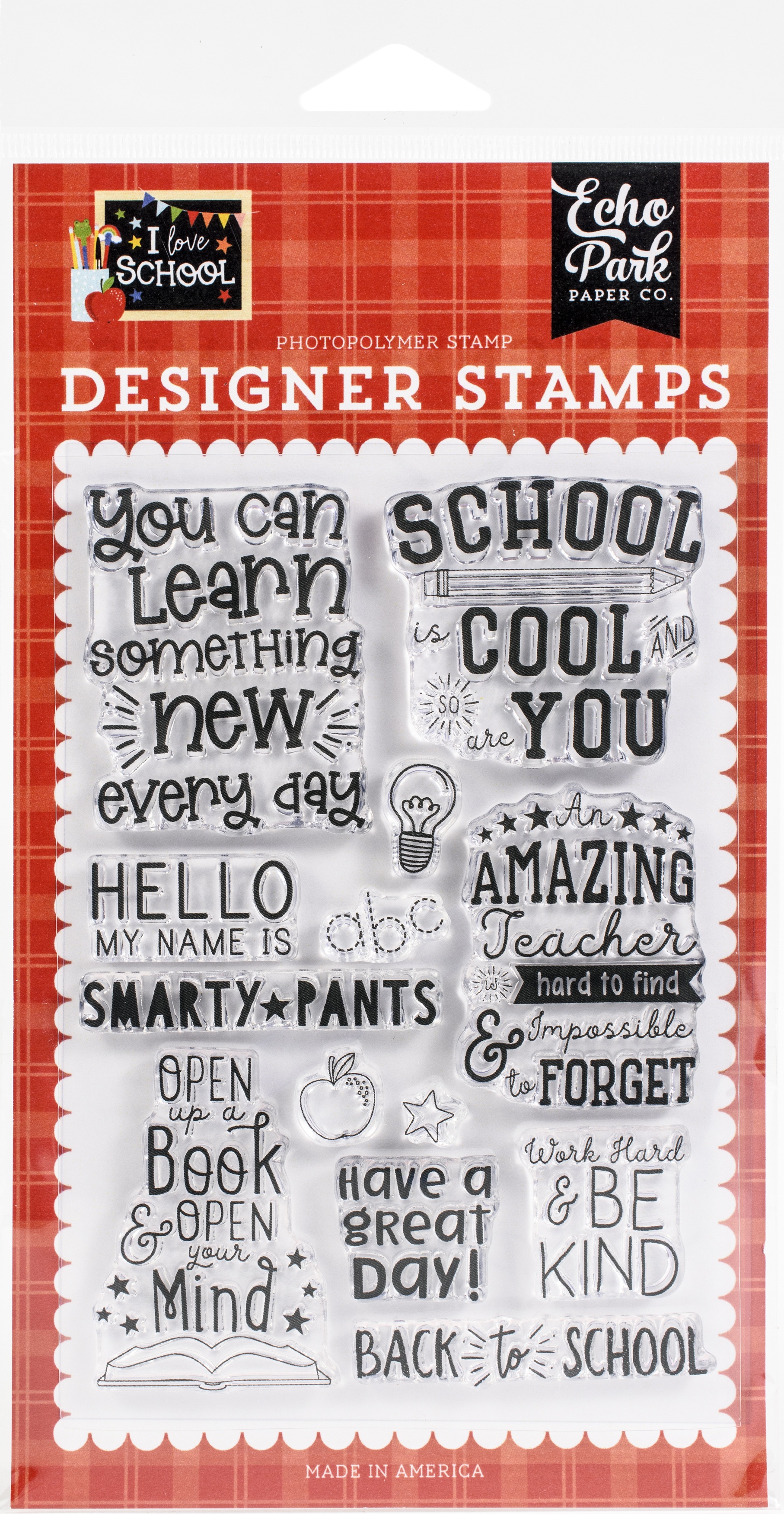 This 4x6 inch stamp set includes 16 stamps. For use with acrylic stamping blocks and stamping ink. Made in the USA.