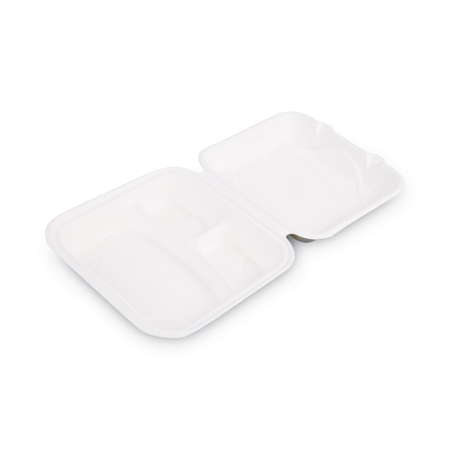 Choose bagasse, a fibrous renewable resource by-product of the sugarcane refining process. Grease- and cut-resistant container provides greater customer satisfaction. Hinged lid speeds and streamlines carryout and to-go orders—no need to hunt around for matching lid. Double-tab closure minimizes the potential for in-transit spills. Food Container Type: Take-out Clamshell; Material(s): Sugarcane; Color(s): White; Number of Compartments: 3.