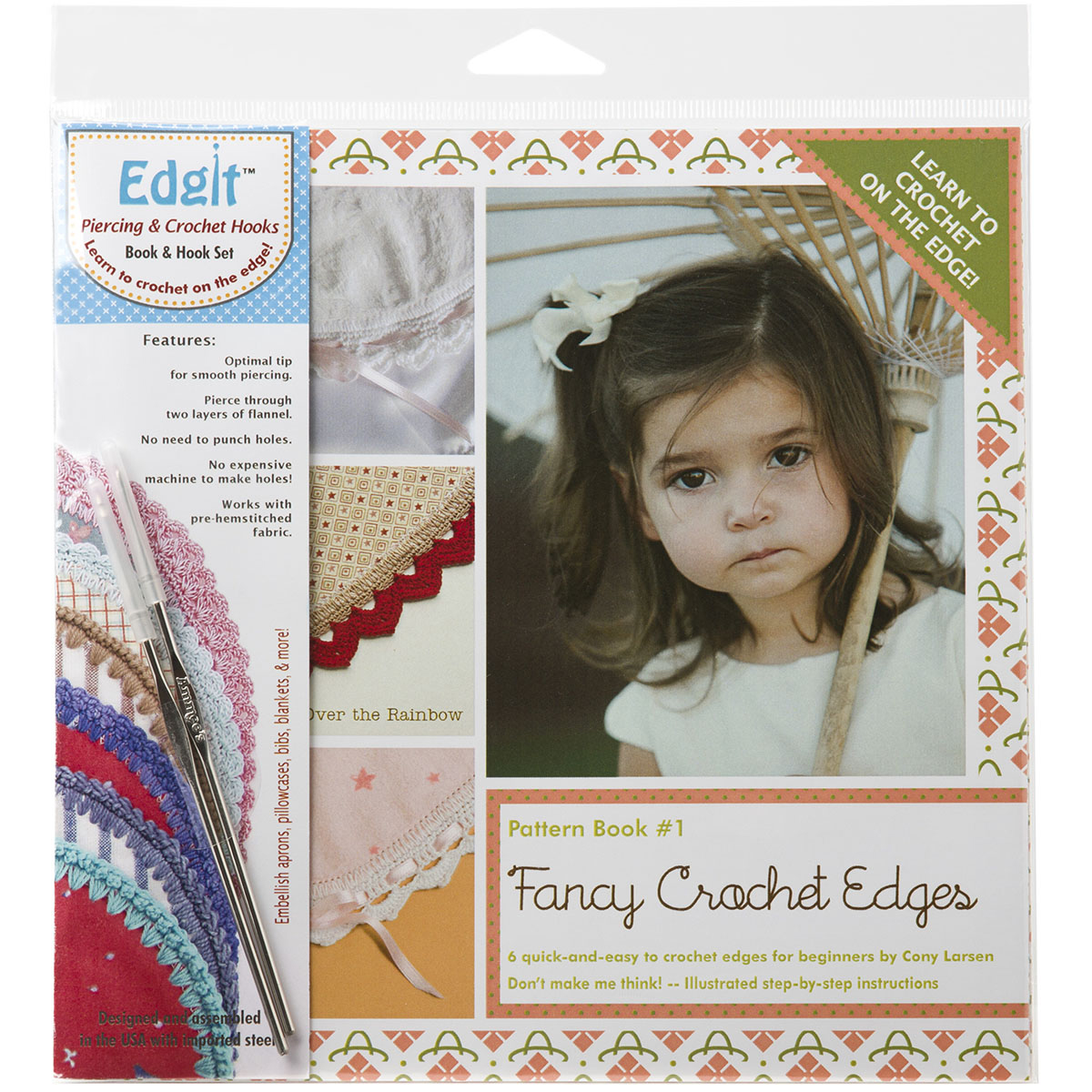 Learn to crochet on the edge! Embellish aprons, pillowcases, bibs, blankets and more! This 8.25x8 inch package contains one book, one Edgit piercing crochet hook and one regular crochet hook. Comes in a variety of designs. Each sold separately. Made in USA.
