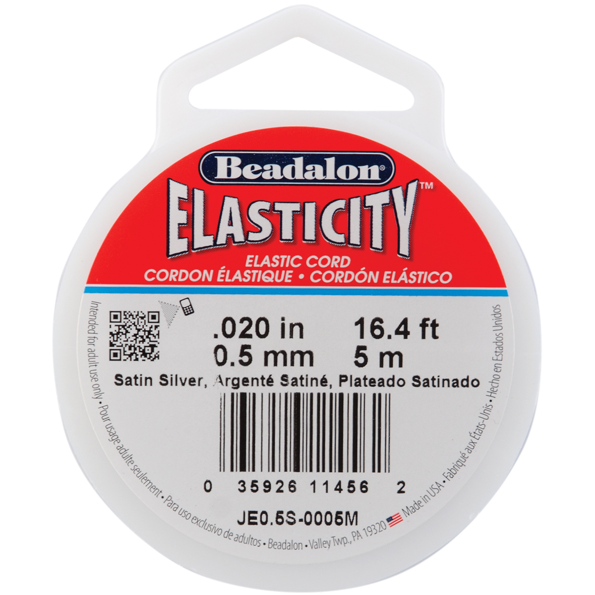 BEADALON-Elasticity. This package contains 5m (16.4ft) of elastic cord with a 0.5mm (0.02in) diameter. Color: Satin Silver. Knotting instructions are included on the packaging. Imported.
