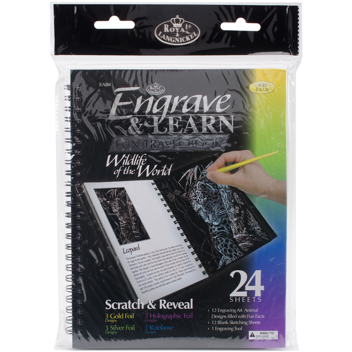 Royal Brush-Engraving Art Travel Book: Wildlife Of The World. A complete engraving art book focused on animals of the world, ideal for any age artist. Constructed with quality artist board and professional artist materials. This package contains one 8- 3/4x7x1/2 inch spiral bound book with twelve pages of pre-printed designs, twelve blank sketching sheets, one scrape tool and easy to understand engraving instructions. WARNING: Choking Hazard- small parts. Not for children under 3 years. Recommended for ages 8 and up. Imported.