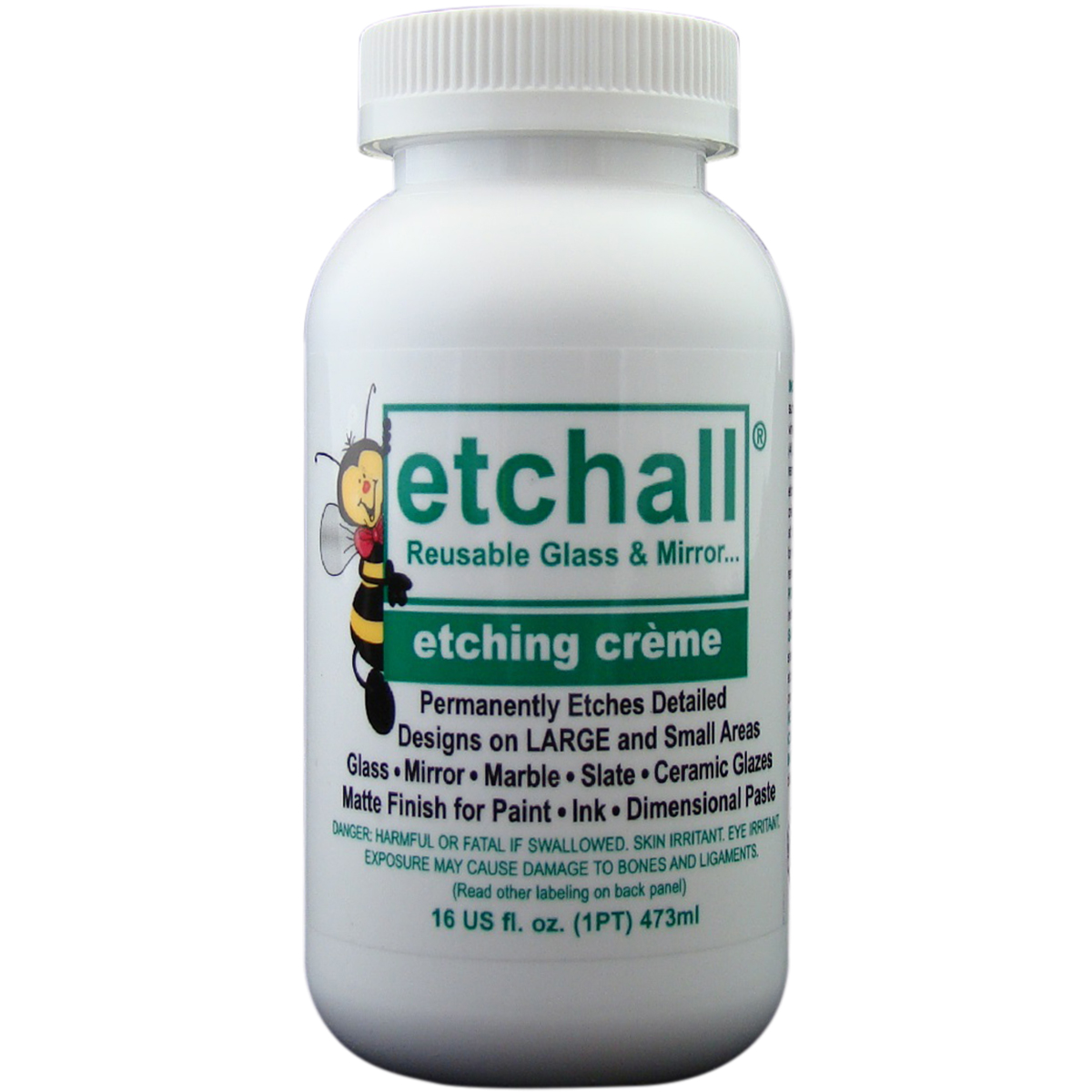 Permanently etches detailed designs on glass, mirrors, marble, slate, ceramic glazes, matte finished paint, ink and dimensional paste. This package contains 16oz of etching creme. Conforms to ASTM D 4236. Made in USA.