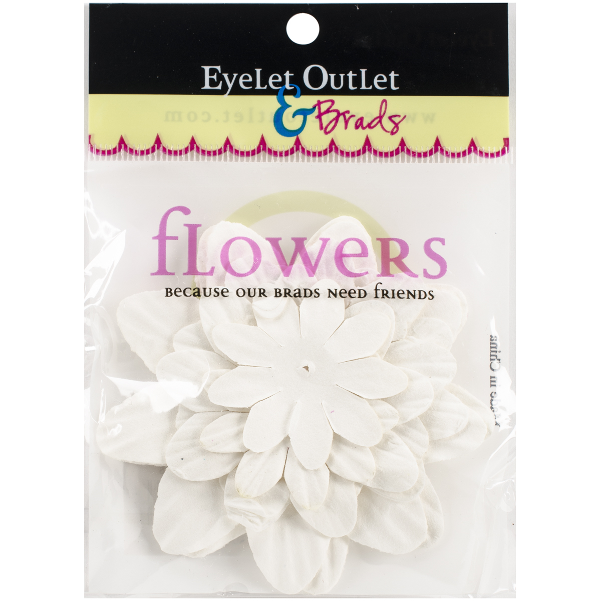 Eyelet Outlet-Flowers. Because your brads need friends! Add a floral look to any project. This 4-1/4x3 inch package contains forty paper flowers in three different sizes. Comes in a variety of colors. Each sold separately. Imported.