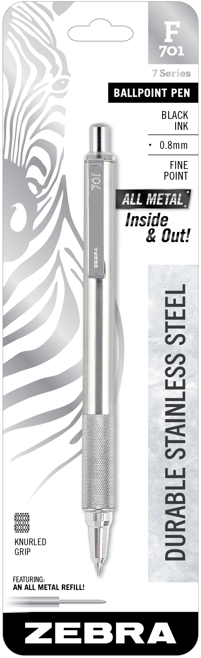 Zebra Pen-F 701 Stainless Steel Ballpoint Pen Fine: Black. This pen features designer stainless steel from tip to clip and a knurled metal grip for writing confidence. This package contains one 0.7mm fine stainless steel ballpoint pen. Imported.