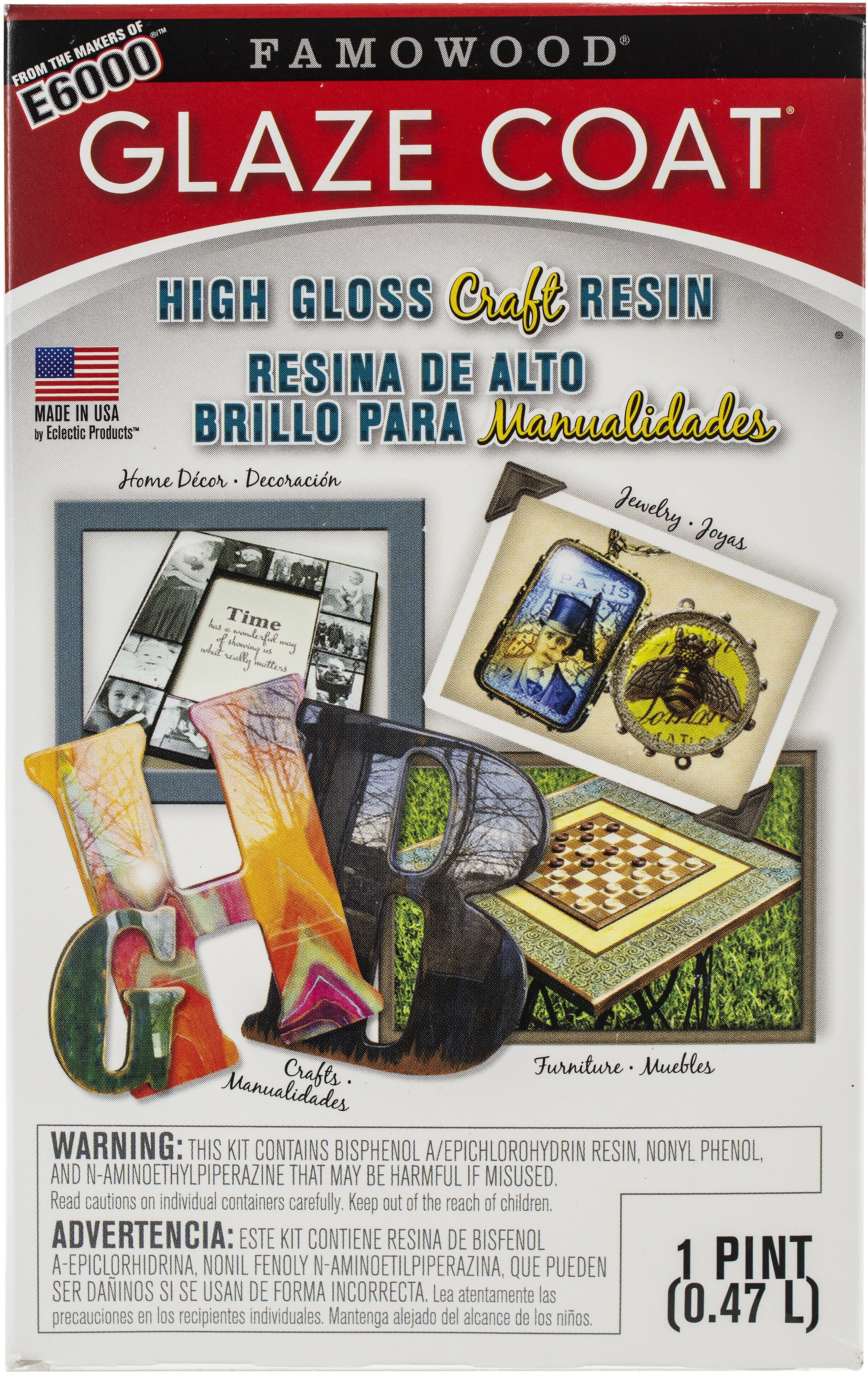 Eclectic-Famowood Glaze Coat Craft Pint Kit: Clear. An ultra-clear epoxy resin that dries to a high gloss finish. It is versatile enough for creating unique jewelry pieces or a coating for use on any surface-smooth or rough, stained, painted or new. Easy 1 to 1 ratio, cures to a hard, smooth professional finish, self-leveling (minimal spreading required), indoor use, resists temperatures up to 120 degrees F. Create, restore, beautify and protect hundreds of project. Ideal for creating jewelry, creating beautiful craft tables, beautifying clocks, picture frames, embedding keepsakes and jewels, bed trays, jewelry boxes, plaques & much more. This package contains one pint of glaze coat clear epoxy resin. Made in USA.