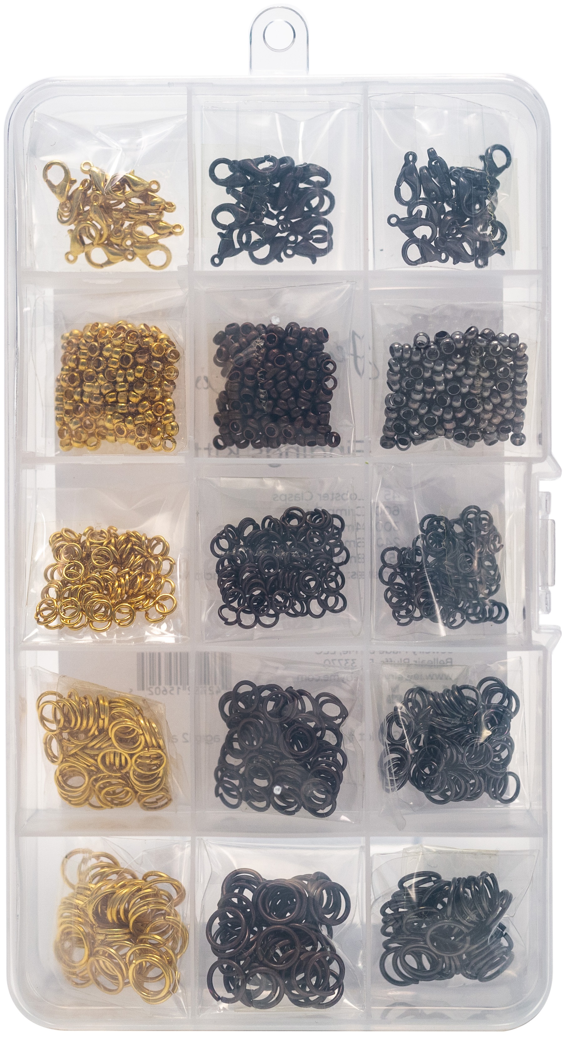 Use this findings kit for all of your DIY jewelry projects. There are 1335 pieces in all. Included in the kit are lobster clasps, crimp beads and jump rings. These all come in three different finishes, Gold, Ox Copper and Black Nickel. Perfect for jewelry, necklace, bracelet earrings and more! Use one or all to create to create a unique piece, designed by you!