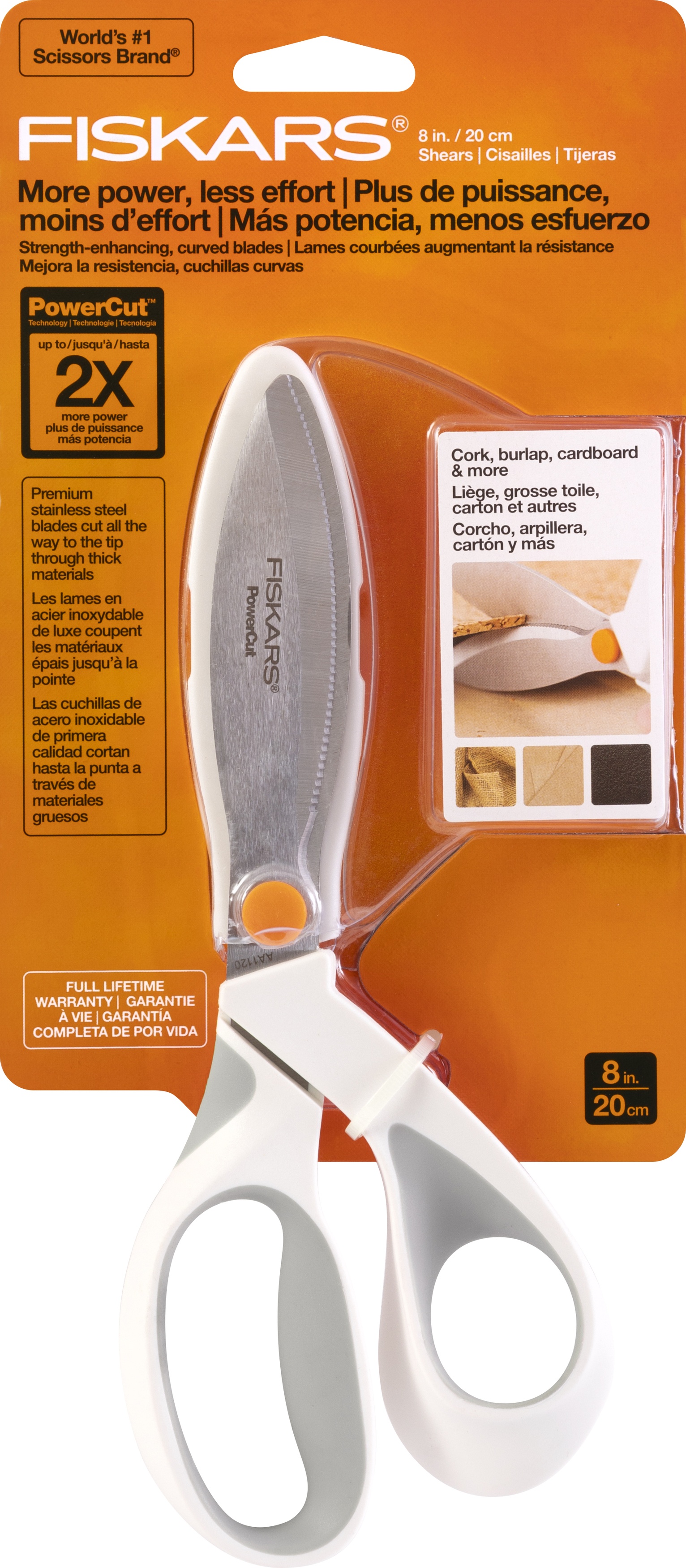 These tools offer optimal optimal balance of size, power and precision. This 4.75x10.75 inch package contains one pair of eight inch powercut shears with stainless steel blades and a serrated edge. WARNING: May contain items with sharp edges. Handle with care. WARNING: Cut Hazard, Sharp Blade. Contact may result in injury. Always keep blades away from fingers and body. Handle with Care. Keep out of reach of children. Made in USA.