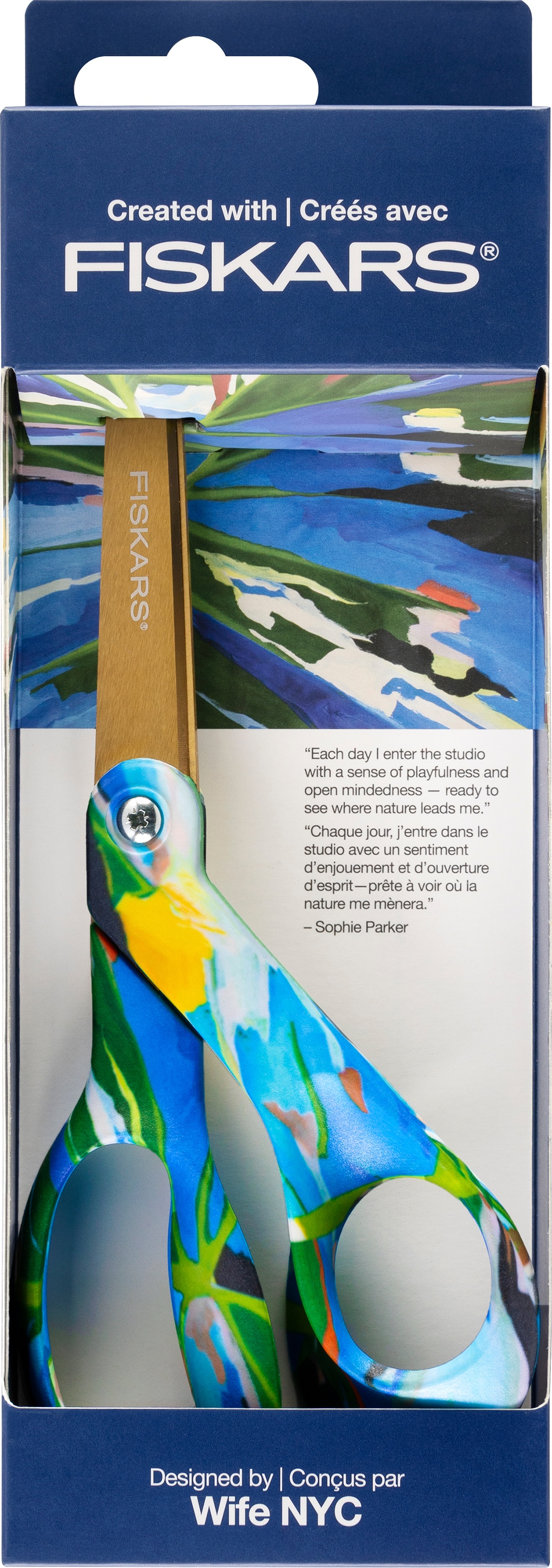 Enjoy the same premium performance and exceptional comfort as The Original Orange-Handled Scissors(TM). Created with Fiskars(R) Scissors collaborate with artists to create artful handles that add adventure to your collection and are ergonomically sculpted to fit your hand for exceptional comfort & control. The high-grade, precision-ground stainless steel blades stay sharp and cut all the way to the tip. Titanium blade coating is 3x harder than steel to resist wear, scratches and corrosion. Bent handle keeps material flat for mistake-free cutting. Cuts a wide variety of materials, including denim, silk and multiple layers of fabric. This package contains one pair 8 inch scissors. Full lifetime warranty. Imported.
