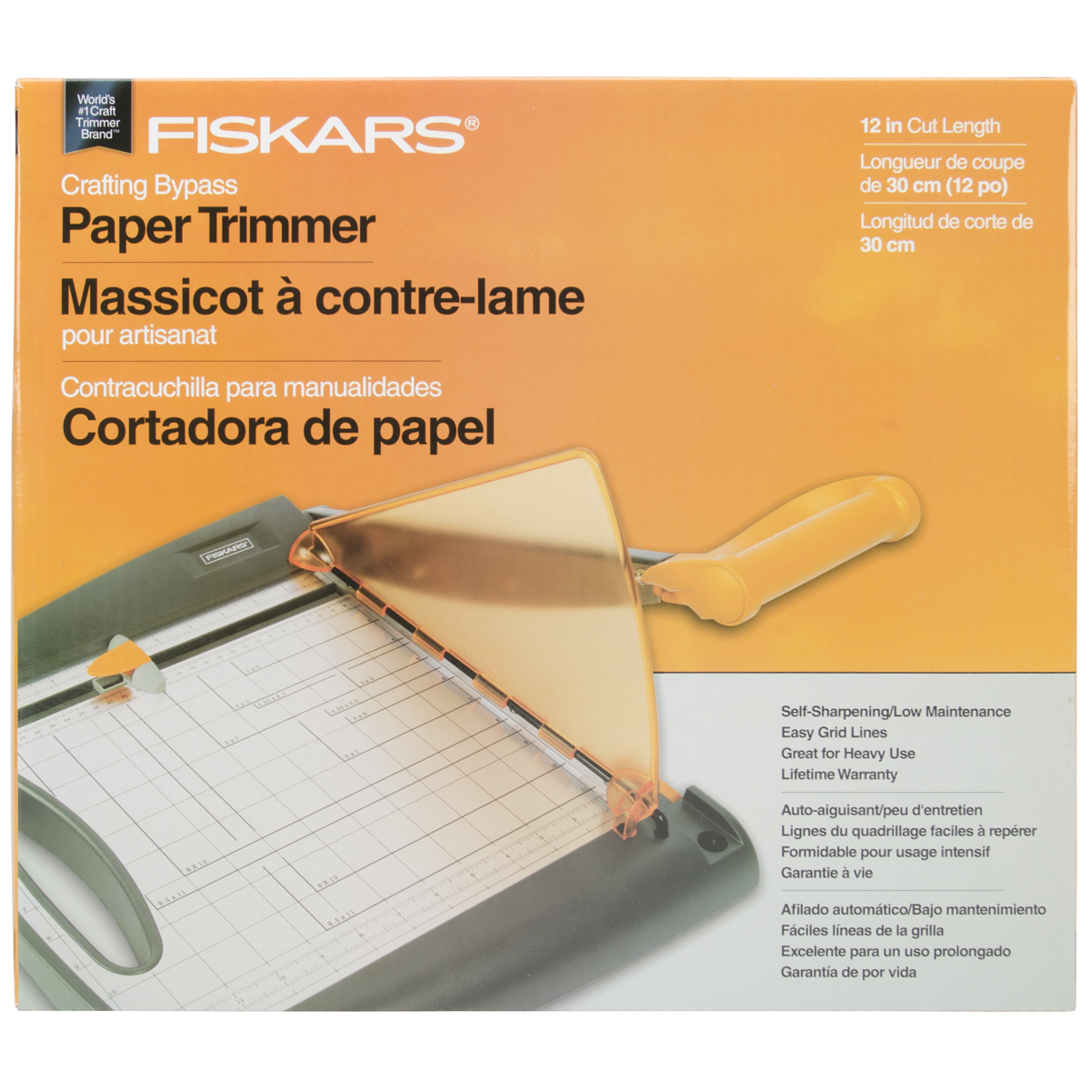 FISKARS-Euro Bypass Trimmer. A perfect way to create straight and even lines every time! The blade is self-sharpening and is low maintenance. There are multiple grid lines to create the exact size paper you need. Great for heavy use! The quality features (paper stop, built in handle, safety guard, safety lock and ergonomic handle) will make cutting your papers hassle free. This package contains one bypass trimmer with a full twelve inch cutting length. Imported.