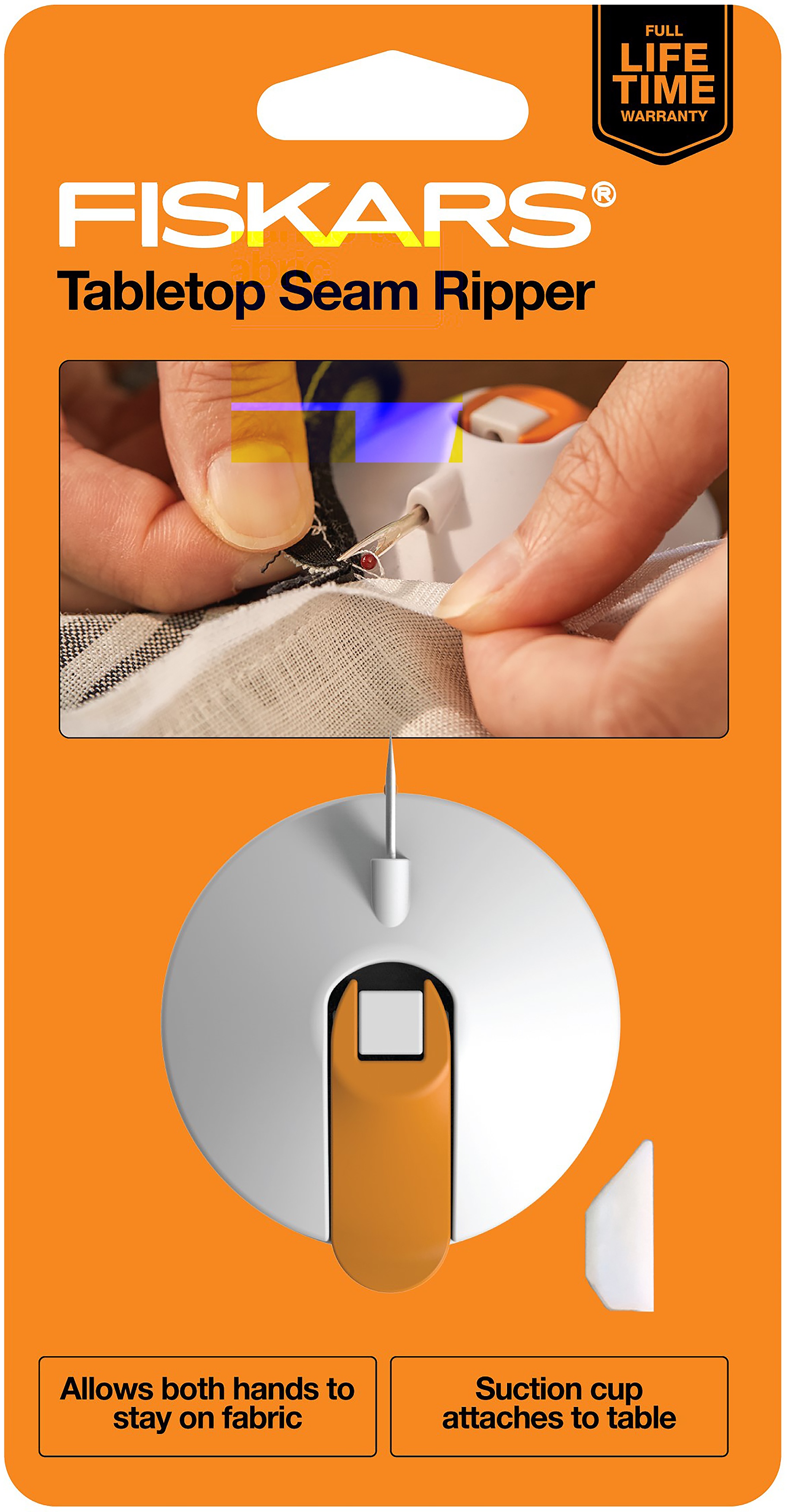 Fiskars Tabletop Seam Ripper is an easy-to-use, tabletop tool that provides a faster, less stressful way to rip seams-without damaging your fabric. The spring-loaded, powerful suction cup attaches to nearly any non-porous work surface and locks securely in place, allowing you to keep both hands on your project. A locking lever lets you easily move and secure the tool wherever you need it most, while a premium steel blade offers lasting durability. When not in use, a protective cap snaps into its own compartment to keep it from getting lost.