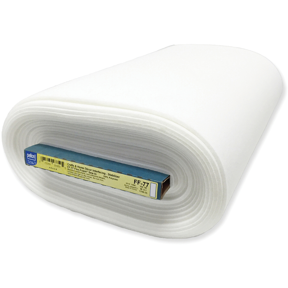 Pellon-Flex Foam Stabilizer: White. Offers lightweight stability and long-lasting body. It is easy to handle and easy to sew. Gives a professional look to all project types. Machine washable and dryer safe. 100% Polyester fabric outer and 100% polyurethane inner. This package contains 10 yards of 20 inch wide flex-foam stabilizer. Imported.
