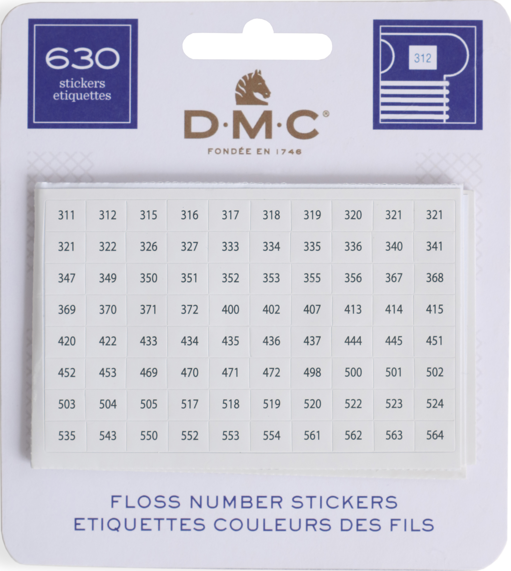 DMC-Floss Number Stickers. A set of small; pre-printed label stickers that are made to fit on DMC plastic floss bobbins (sold separately). These stickers are printed with all solid and variegated color numbers plus extra labels for popular shades and blank labels for filling in yourself. This package contains a total of 630 number stickers. Imported.
