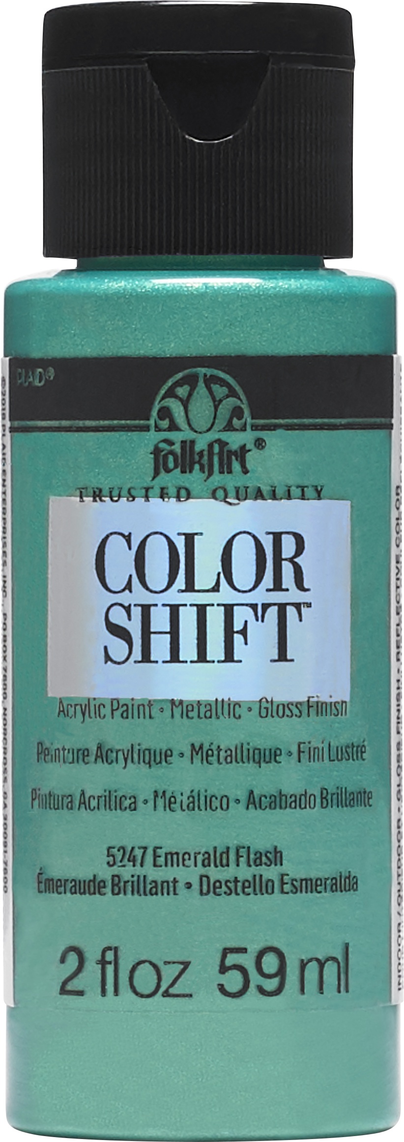 Plaid-FolkArt: Color Shift 2oz. Indoor/outdoor acrylic paint creates a luster with colors that shift in changing light. Offers superior coverage. Cleans up with soap and water. Water-base non-toxic. This package contains 2oz of acrylic paint. Comes in a variety of colors. Each sold separately. Conforms to ASTM D4236. Made in USA.