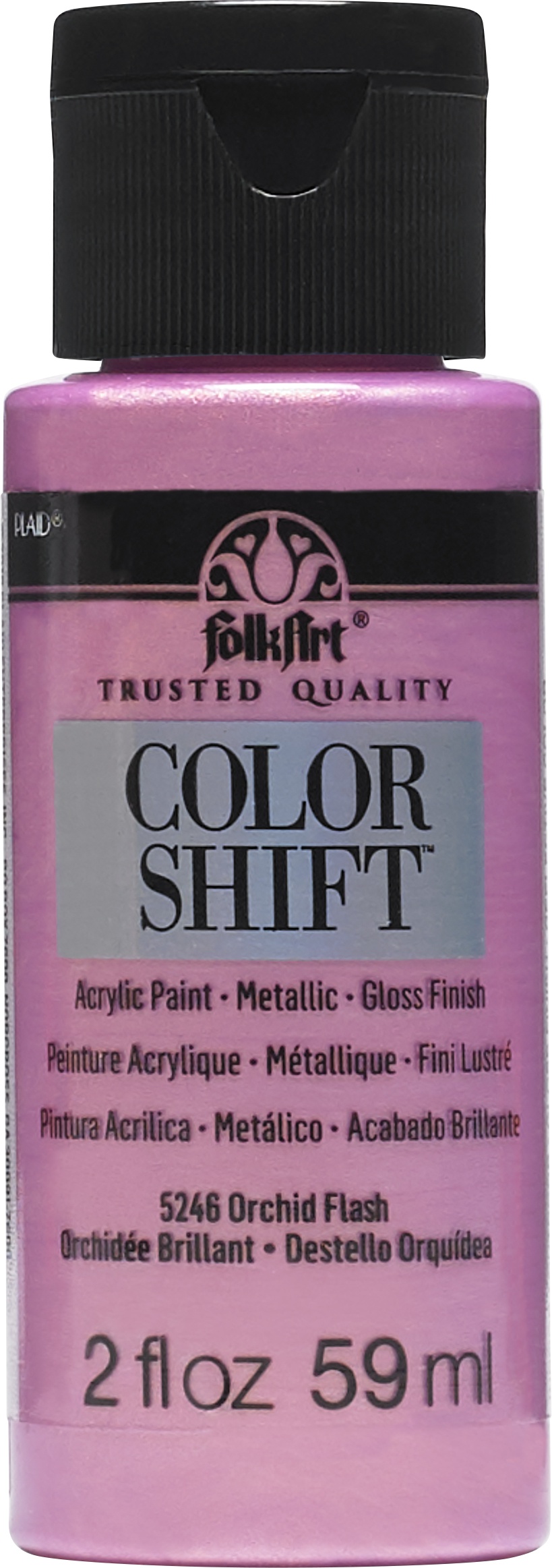 Plaid-FolkArt: Color Shift 2oz. Indoor/outdoor acrylic paint creates a luster with colors that shift in changing light. Offers superior coverage. Cleans up with soap and water. Water-base non-toxic. This package contains 2oz of acrylic paint. Comes in a variety of colors. Each sold separately. Conforms to ASTM D4236. Made in USA.
