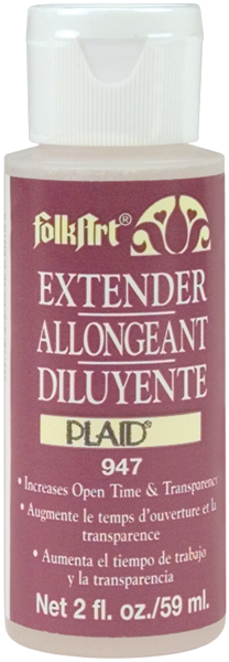 FOLK ART-2 fluid ounces of extender. Increases open time and transparency. Thins paint, waterbase for acrylic painting. Conforms to ASTM D 4236. Non-toxic.