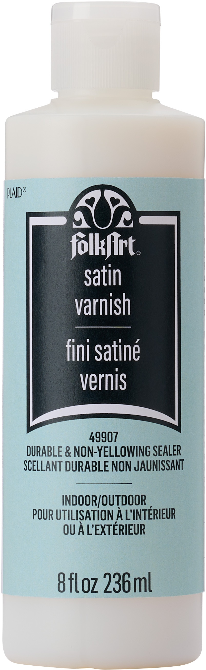 - great for indoor and outdoor projects! Use FolkArt Satin Varnish on a variety of porous and non-porous surfaces such as wood, paper, canvas, paper mache, and so much more. This package contains 8oz bottle of satin varnish. Made in USA.