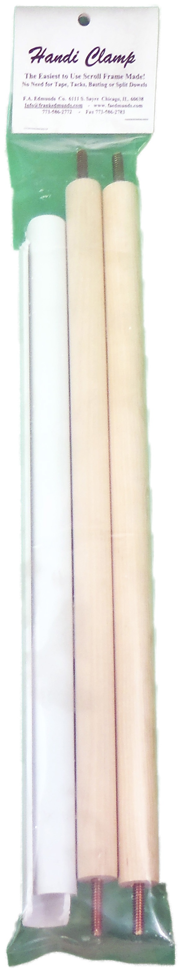 The Handi Clamp needlework scroll frame line features a PVC clamp system to hold fabric tightly in place. This package contains two 12 inch long rods with clamps. Made in USA. WARNING: Drilling, sawing, sanding, or machining wood products can expose you to wood dust, a substance known to the State of California to cause cancer. Avoid inhaling wood dust or use a dust mask or other safeguards for personal protection. For more information go to www.P65Warnings.ca.gov/wood.
