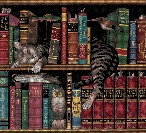 DIMENSIONS-Frederick the Literate. Counted Cross Stitch. What a place for a catnap! This is Frederick's idea of curling up with a good book. The detail of this feline portrait will entrance you and the humor will keep you smiling. This design is ideal for both the cat lover and the bibliophile. Kit contains: cotton and metallic thread, 14-count black Aida, thread palette, needle and easy instructions. Finished size: 12x11 inches. (mat/frame not included).