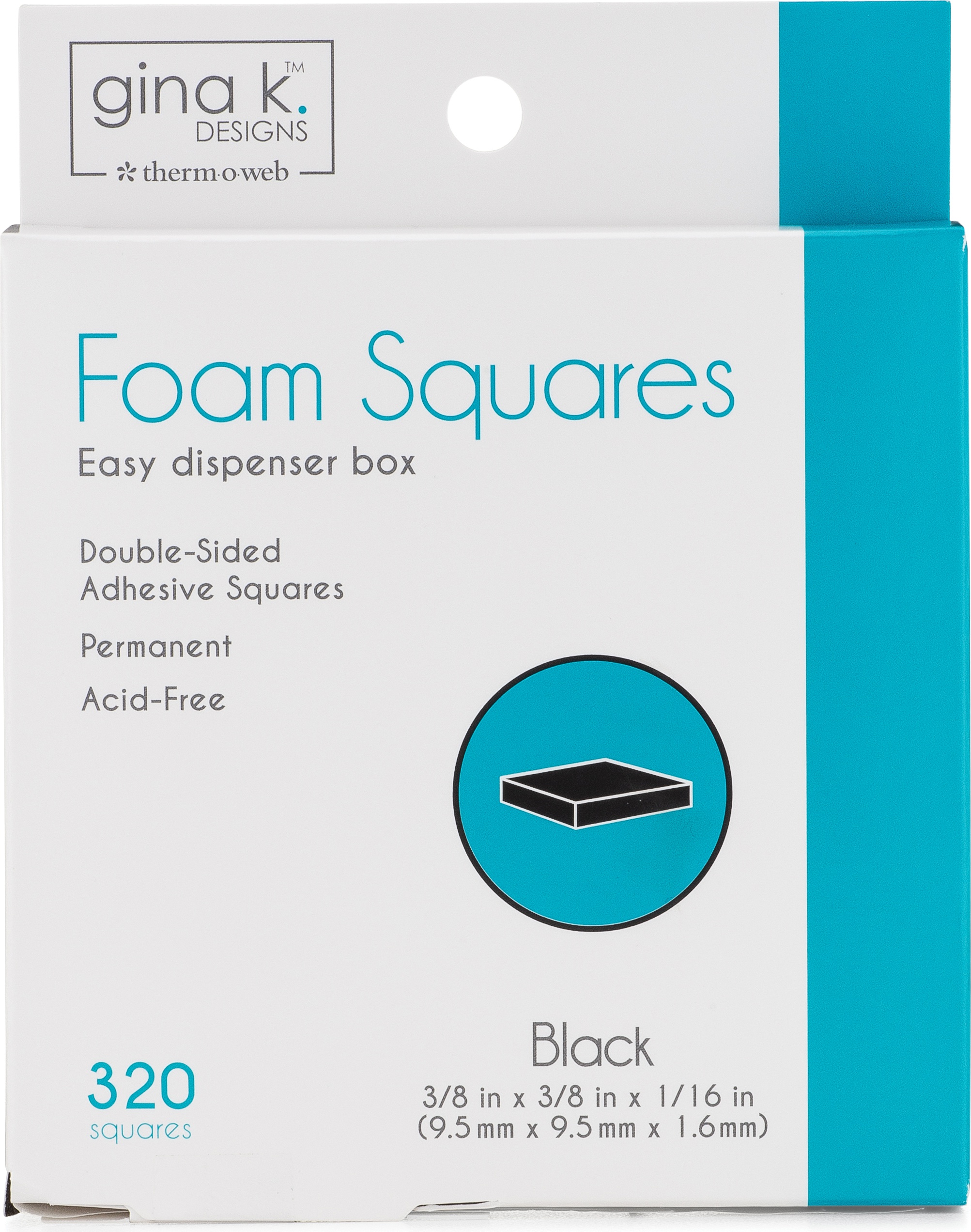 Gina K. Designs Foam Squares are the ideal way to add a pop of dimension to your paper crafts, scrapbook pages, cards and more! Each double-sided adhesive square is .375 x .375 x .0625 in thick foam (9.5mm x 9.5mm x 1.6mm). They come in a convenient dispenser box. Permanent and acid-free. Available in white or black; each sold separately. Package includes 320 squares. Made in the USA.