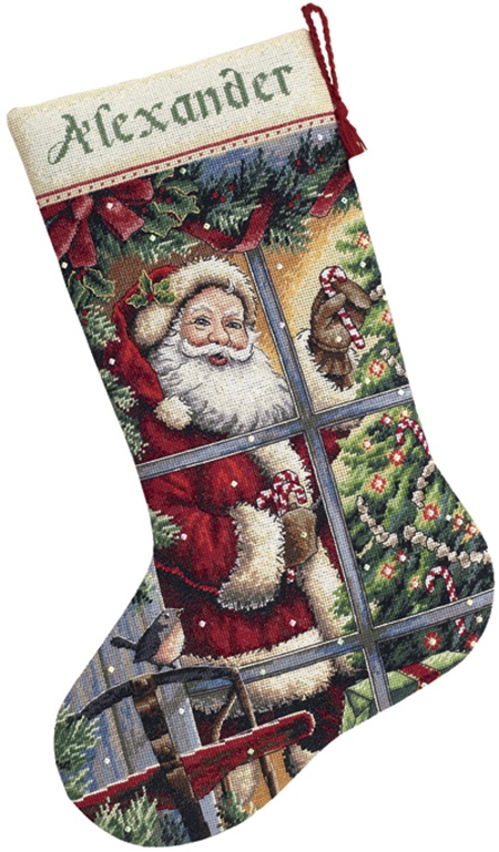 DIMENSIONS-The Gold Collection: Counted Cross Stitch: Holiday Collection. The Gold Collection Kits are wonderfully detailed with full and half cross stitches. This kit contains 16 count Aida, cotton thread, wool yarn, felt (for backing), sequins, needle, and easy to follow instructions with an alphabet for personalization. Finished size: 16in long. Design: Candy Cane Santa. Designer: Donna Race. Made in USA.