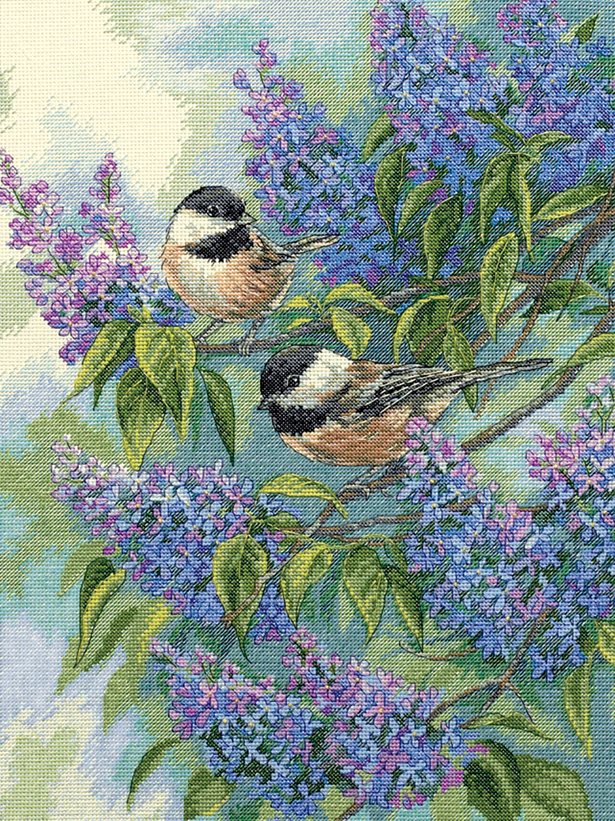 DIMENSIONS-The Gold Collection: Counted Cross Stitch. The Gold Collection Kits are wonderfully detailed with full and half cross stitches. Kit includes: 14 count Aida, cotton thread, color-coded thread sorter, needle and easy instructions. Mat and frame are not included. Finished size: 16x12in (30x41cm). Design: Chickadees & Lilacs. Designer: Rosemary Millette. Imported.