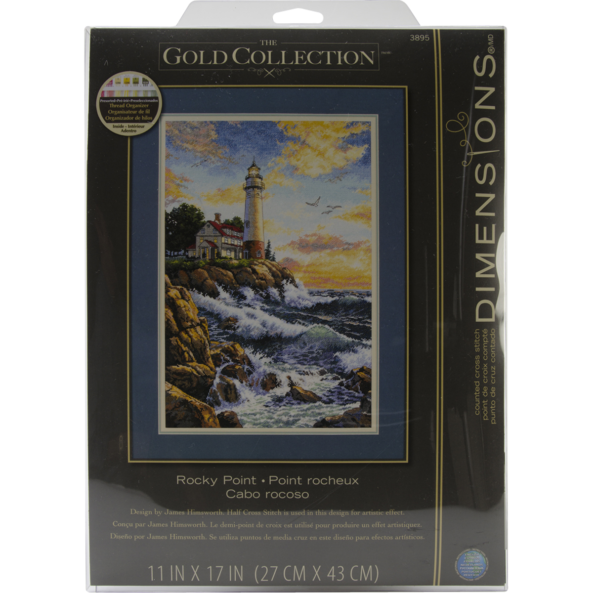 DIMENSIONS-The Gold Collection: Counted Cross Stitch. The Gold Collection Kits are wonderfully detailed with full and half cross stitches. Kit includes: 18 count ivory Aida, cotton thread, thread sorter: needle, and easy to follow instructions. Finished size: 17H x 11W. Design: Rocky Point. Designer: James Himsworth. Imported.