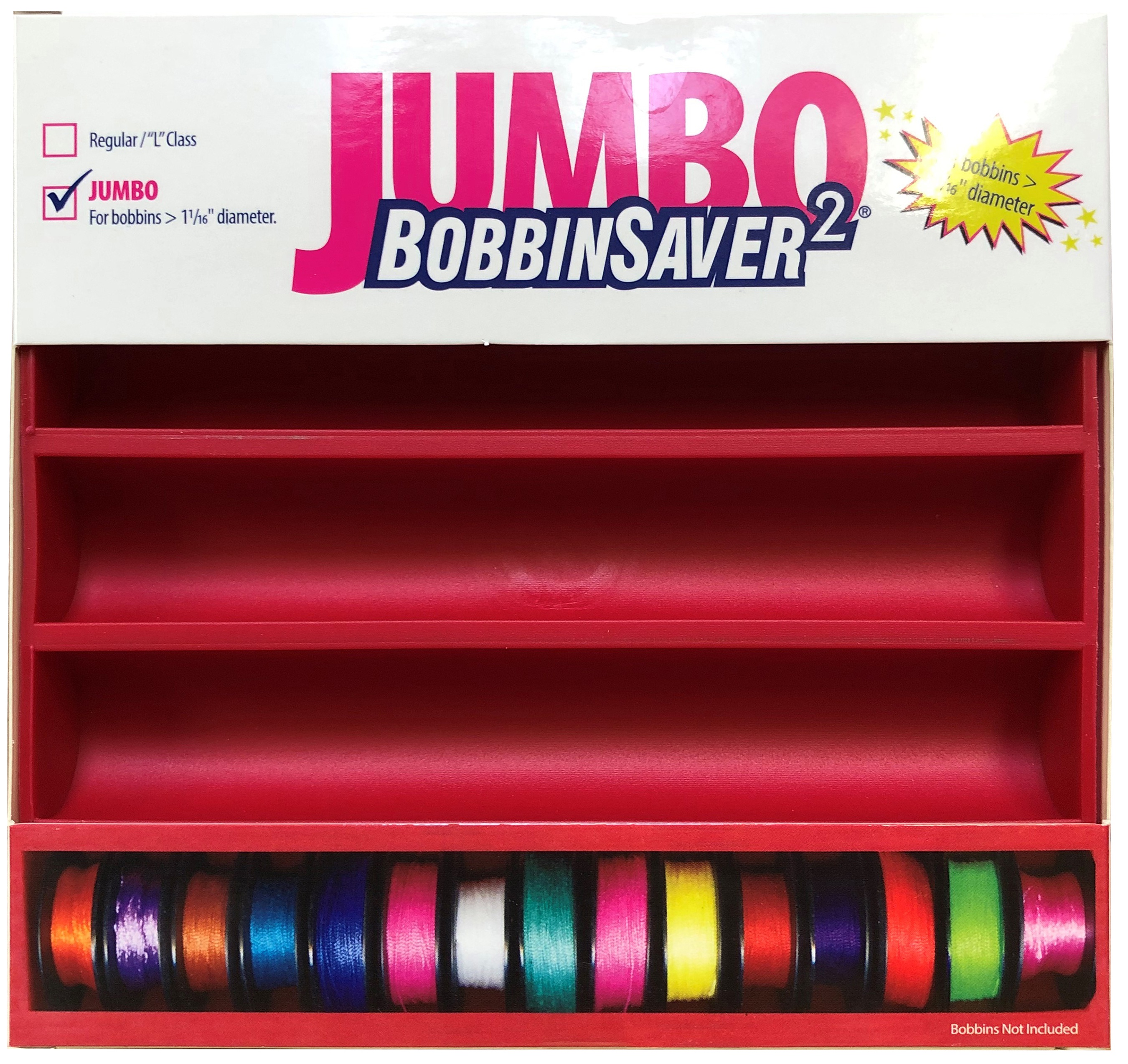 The JUMBO BobbinSaver 2 is made of the same flexible plastic as the original BobbinSaver 2. The JUMBO version fits snuggly around metal or plastic bobbins measuring at least 1.0625 inch in diameter. This package contains one 6x6x.875 inch BobbinSaver. Imported.