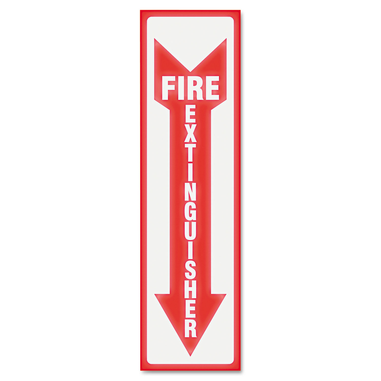 Design promotes high visibility from a distance. Made of durable, tear-resistant plastic. Graphics glow in the dark for added safety. Frame Color: Red; Size: 4 x 13; Message(s): Fire Extinguisher; Material(s): Durable Plastic.