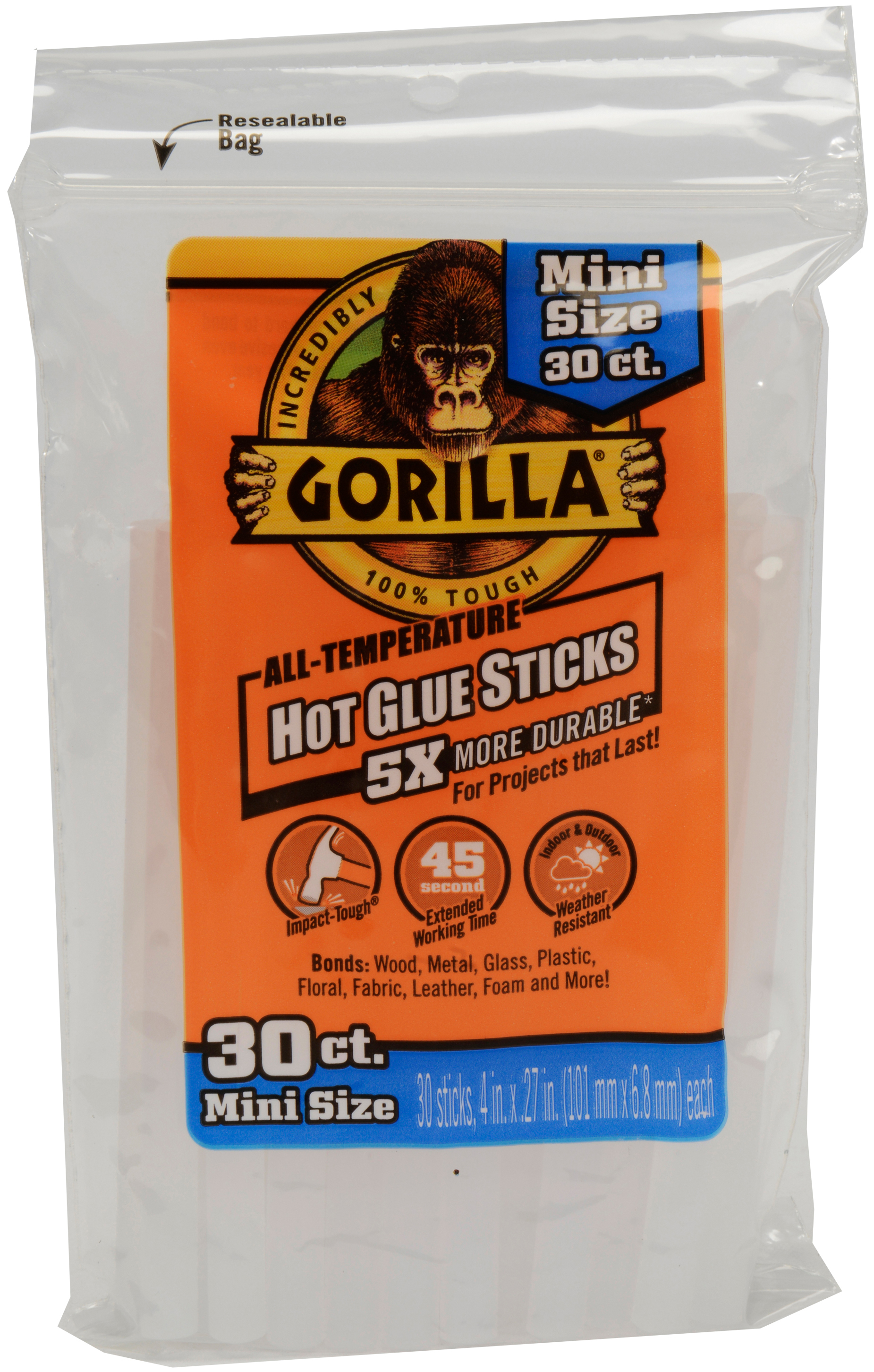Incredibly tough & versatile, Gorilla hot glue sticks provide a long term hold even on hard to hold surfaces. The clear adhesive works with both high and low temperature glue guns and features an extended working time for added convenience for all types of projects. The adhesive even withstands seasonal swings so your projects last year after year. This package contains 30 .27x4 inch high-temp mini glue sticks. Non-toxic. Conforms to ASTM D 4236. Made in USA.