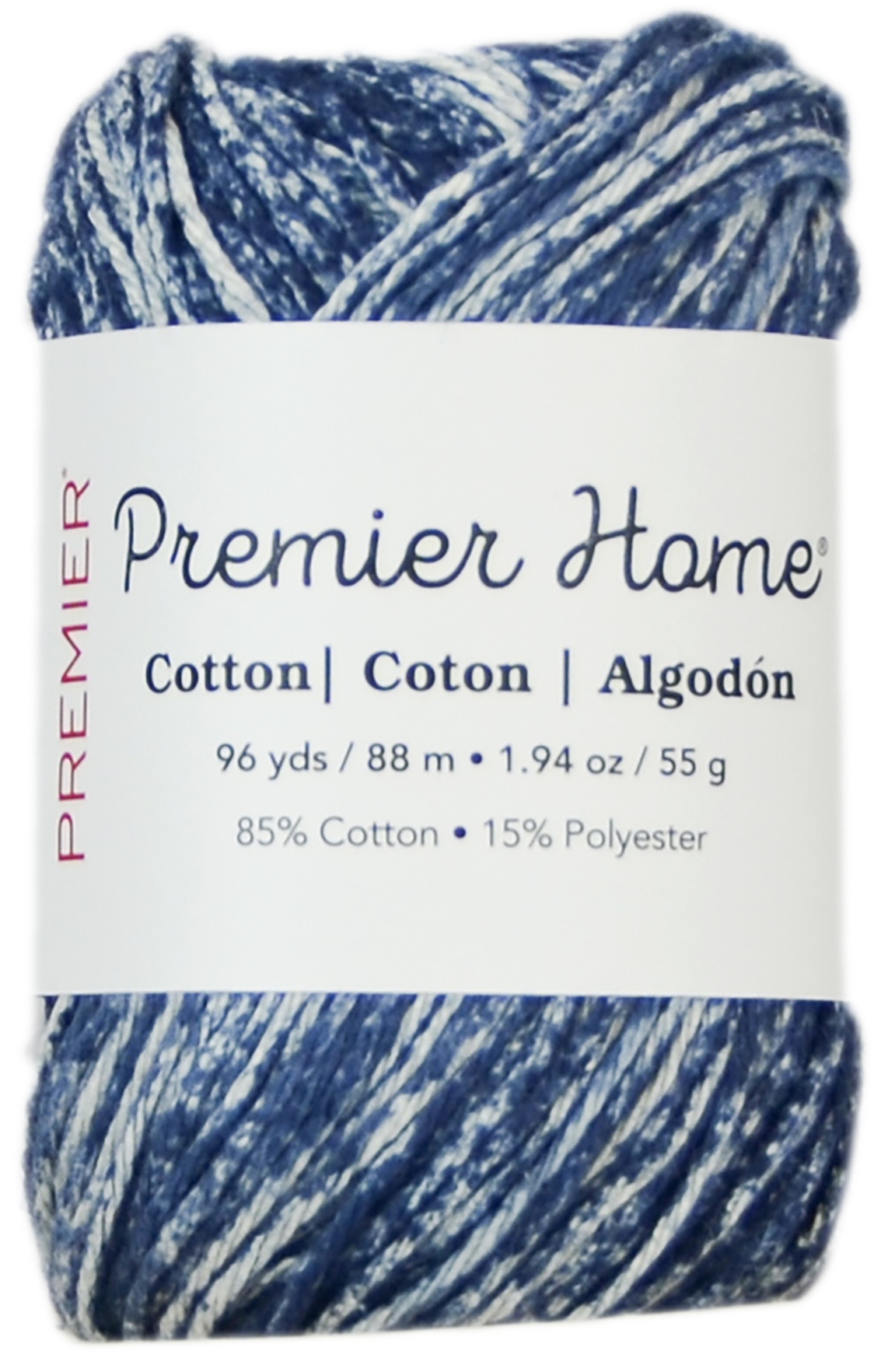 PREMIER YARN-Home Cotton Yarn-Multi. This medium weight cotton blended with polyester means colors stay brighter longer, finished projects dry faster and projects are more durable to last longer! Perfect for mesh wash cloths and more! Weight Category: 4. Content: 85% cotton, 15% polyester. Putup: 2.1oz/60g, 105yd/96m. Gauge: 18stx24r = 4in/10cm on size US8/5mm knitting needles. Suggested crochet hook size US1-9/5.5mm. Dyelotted: we try but are not always able to match dyelots. Care: machine wash, dryer safe, do not bleach, do not iron, do not dry clean. Comes in a variety of colors. Imported.