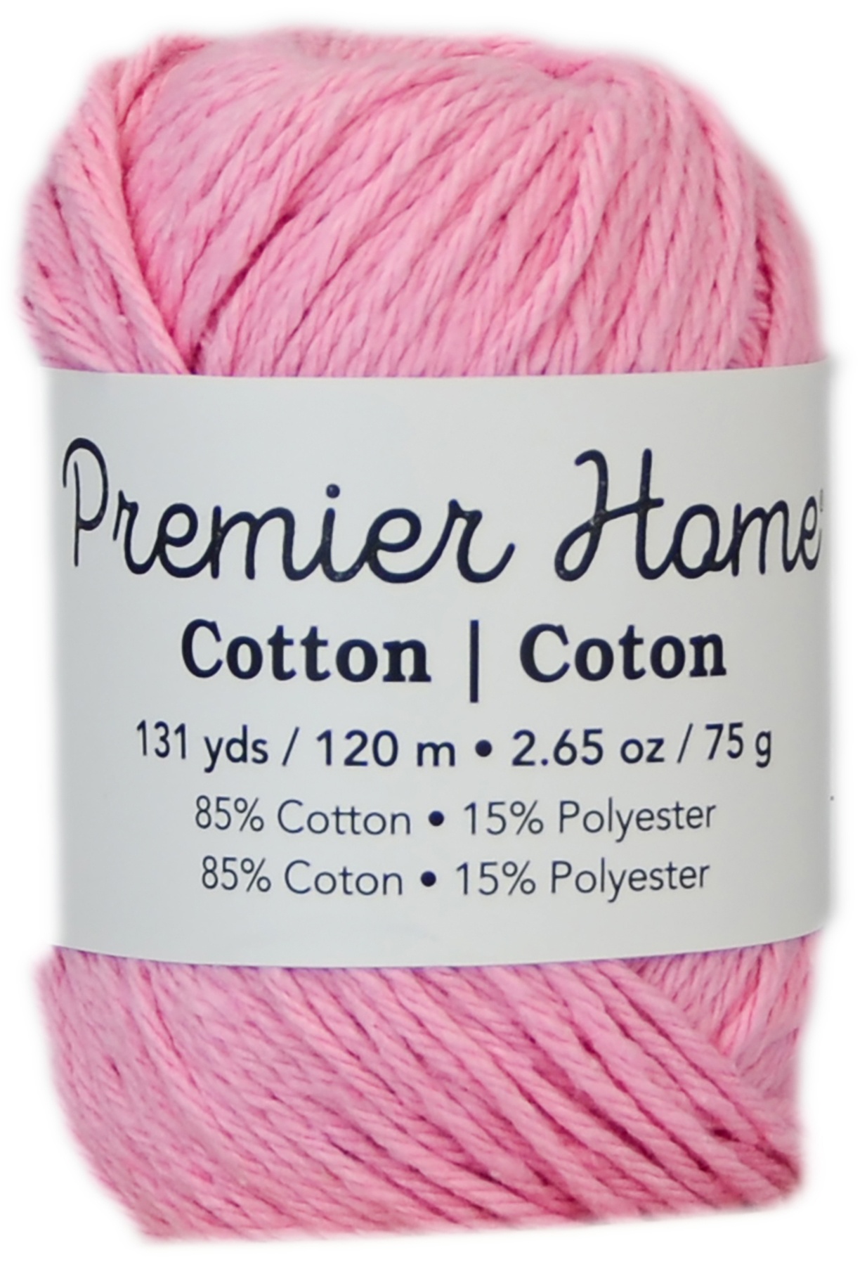 PREMIER YARN-Home Cotton Yarn. This medium weight cotton blended with polyester means colors stay brighter longer, finished projects dry faster and projects are more durable to last longer! Perfect for mesh wash cloths and more! Weight Category: 4. Content: 85% cotton, 15% polyester. Putup: 2.8oz/80g, 140yd/128m. Gauge: 18stx24r = 4in/10cm on size US8/5mm knitting needles. Suggested crochet hook size US1-9/5.5mm. No dyelot. Care: machine wash, dryer safe, do not bleach, do not iron, do not dry clean. Comes in a variety of colors. Imported.