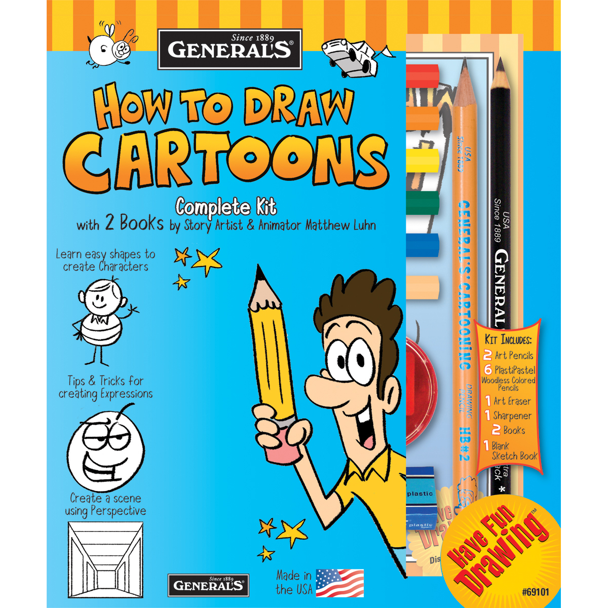 GENERAL PENCIL-How To Draw Cartoons Kit. Matthew Luhn developed this fun and easy-to-follow method of drawing and carooning over the past 15 years of teaching cartoonists of all ages. Filled with techniques and lessons including shapes, shading, perspective, dimension, developing, style, writing, stories and creating morphing effects in flip books these books and kits are ideal for teachers, students and aspiring cartoonists alike. If you are interested in comic arts, cartooning, animation sequential arts, graphic arts, novels drawing or just having fun, these kits are for you! Kit include two lesson booklets, one sketch book, one drawing pencil, eight colored pencils, one black layout pencil, one sharpener and one plastic eraser. Contents conform to ASTM D4236. Made in USA.