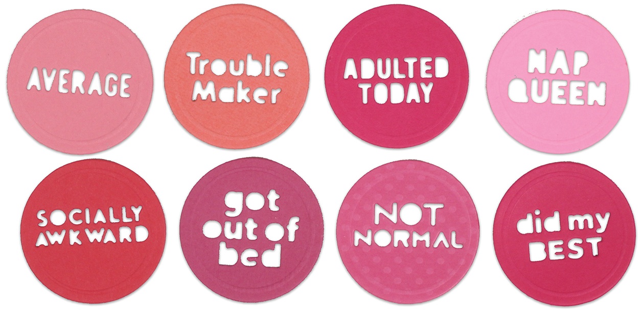 Celebrate the everyday achievements in life with these funny phrases to use with the Ribbon Rosette die 222143, sold separately. Phrases include Overthinker, Adulted Today, Socially Awkward, Trouble Maker, Nap Queen, Got Out of Bed, Not Normal, Did My Best and Average. Die size is approximately 1.375 inches round. Set contains 9 thin metal dies.