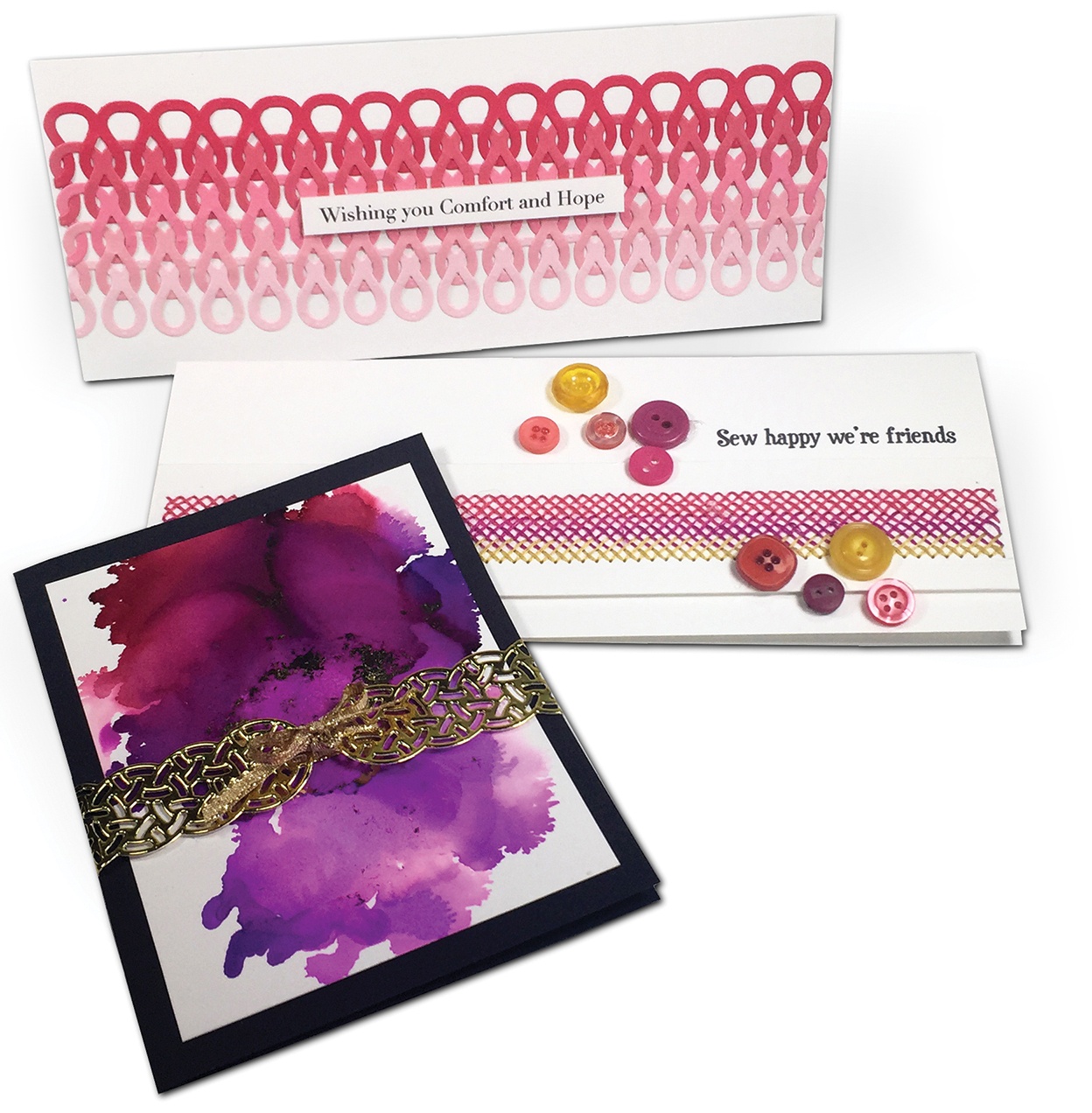 These 3 decorative patterns are designed to embellish slimline cards and so much more. The knit design can be hooked together to create a background pattern like giant knitted paper. The knot pattern is a beautifully intricate border of circle shapes knotted together. The stitches pattern is a background of evenly spaced holes ready to be embellished with embroidery floss in unlimited stitch patterns. All shapes are 8..75 inches long and approximately 1 inches wide. Set contains 3 thin metal dies. Imported.