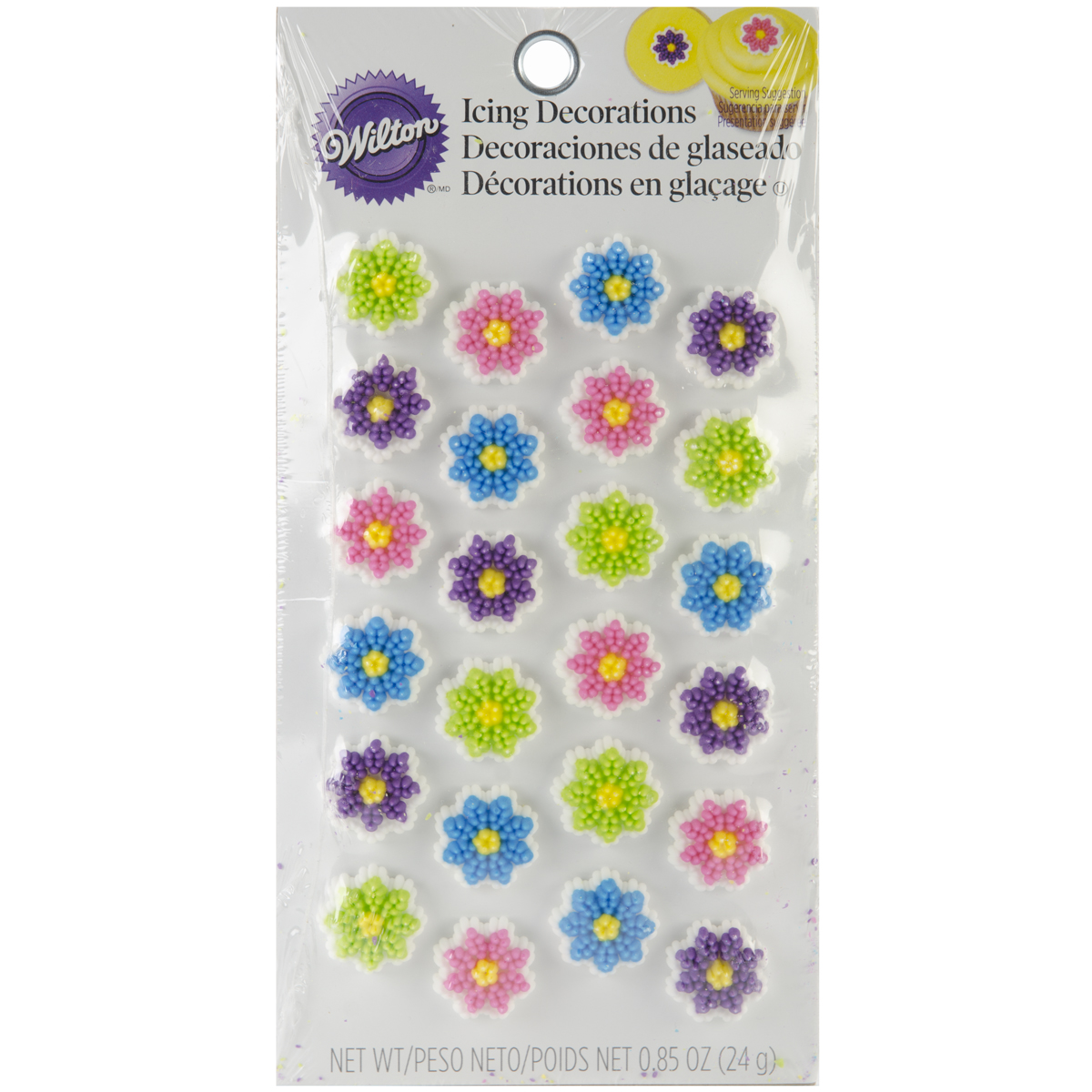 WILTON-Icing Decorations. Add these delicious accents to your cakes and cupcakes for that extra special touch. Each candy flower measures approximately 3/4 inch in diameter. This package contains twenty-four pieces. Imported.