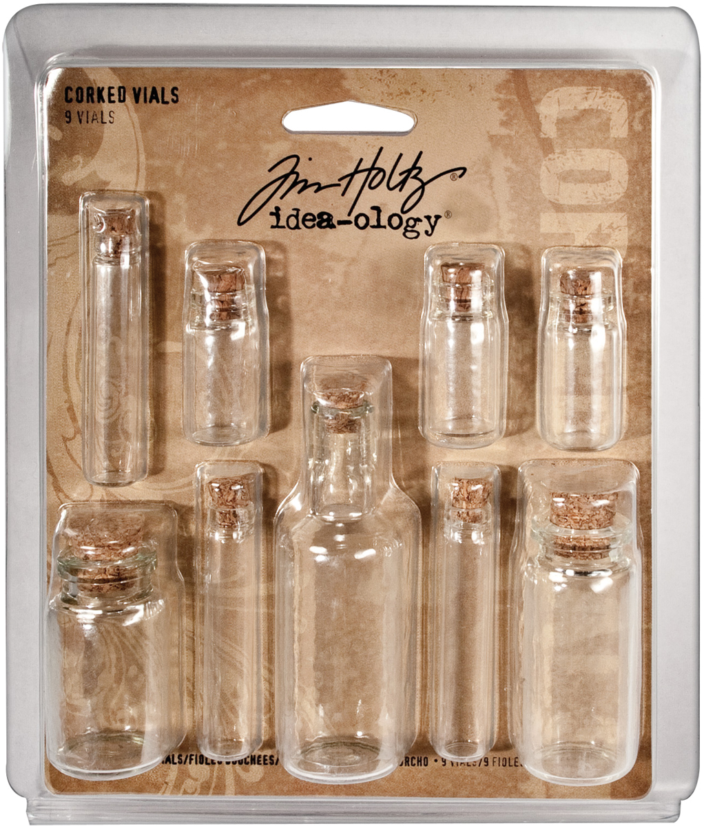 ADVANTUS-Tim Holtz Idea-Ology Corked Glass Vials. Use this assortment of glass containers to hold small objects or elements in your altered art pieces. This package contains 9 glass vials. Size ranges from 1-1/4x1/2 inch to 3x7/8 inch. Imported.