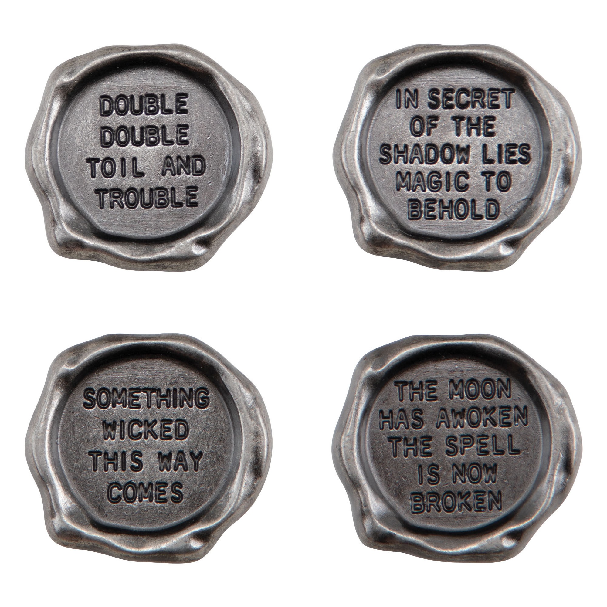 Add a spooky rhyme to your project next time. Tim Holtz Quote Seals for Halloween are metal tokens that look like they were stamped with wax. Each seal features a different quote. Simply adhere for a creepy or poetic touch to your next Halloween craft. 4 pieces Elements measure approximately 1 inch in diameter