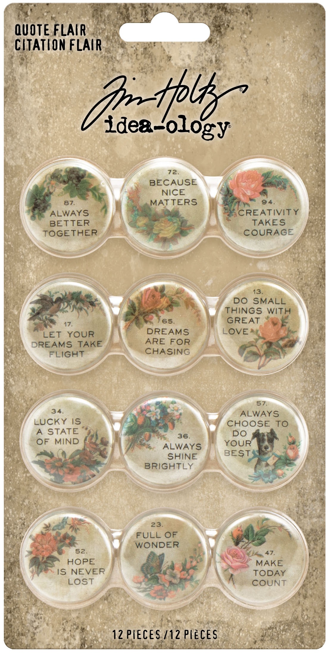 These charming Tim Holtz Quote Flair buttons are the ornamental element your project needs. For a finishing touch with a vintage flair, adorn your make with an insperiational phrase and beautiful floral arrangement to provoke good vibes and whimsy all year round. This package contains 12 1" in diameter buttons. Imported.