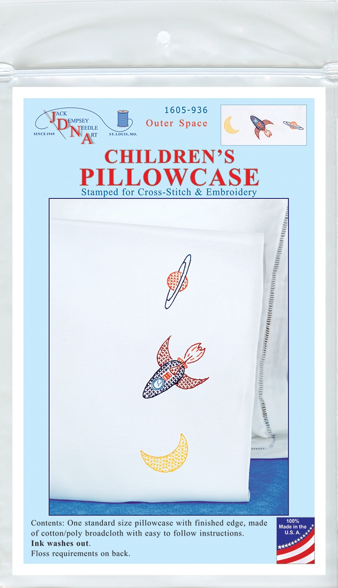 Stitch up a fun pillowcase for your kids with this kit. The stitching design has been stamped using ink that washes away with any liquid and the fabric is a cotton/poly blend broadcloth. This package contains one standard size pillowcase, instructions for completion and care, and complete DMC floss requirements. Hoop, needle, and floss all sold separately. Design: Outer Space. Made in USA.