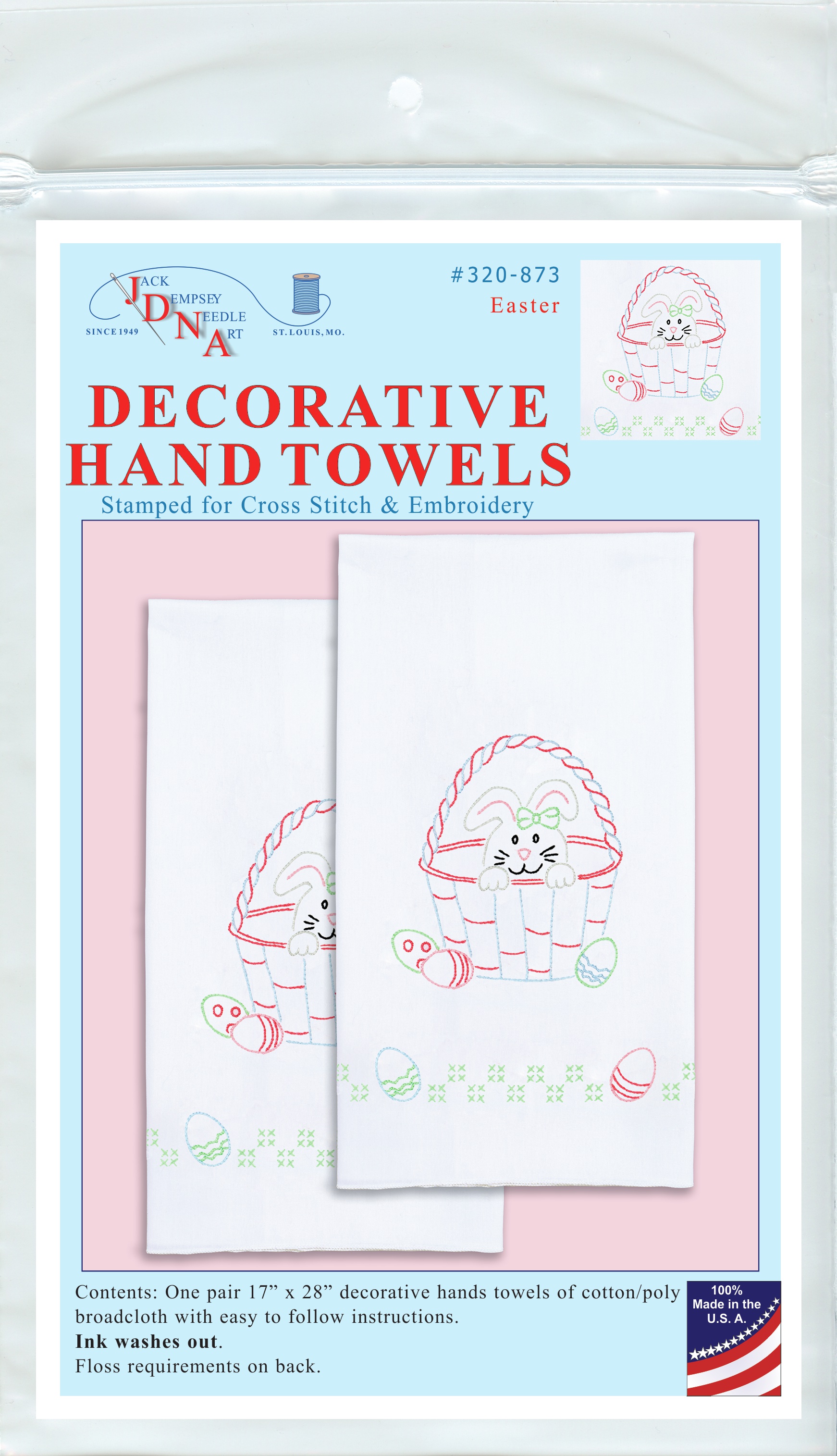 Create beautiful hand towels using this great kit. The stitching designs have been stamped using ink that washes away with any liquid and the fabric is a cotton/poly blend broadcloth. This package contains two 17x28 inch decorative hand towels, instructions for completion and care and a complete list of DMC floss requirements. Hoop, needle and floss sold separately. Design: Easter. Made in USA.
