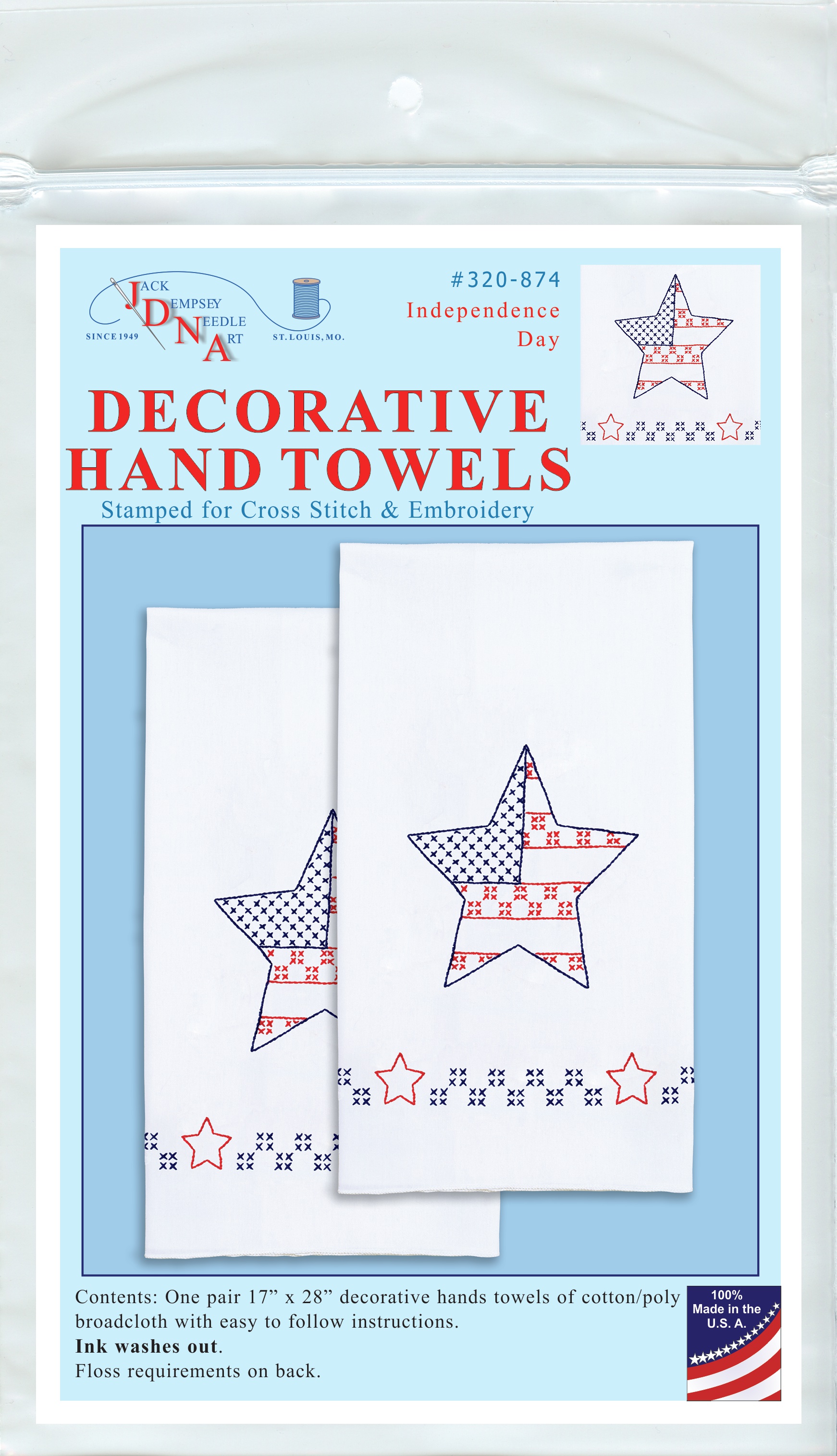Create beautiful hand towels using this great kit. The stitching designs have been stamped using ink that washes away with any liquid and the fabric is a cotton/poly blend broadcloth. This package contains two 17x28 inch decorative hand towels, instructions for completion and care and a complete list of DMC floss requirements. Hoop, needle and floss sold separately. Design: Independence Day. Made in USA.