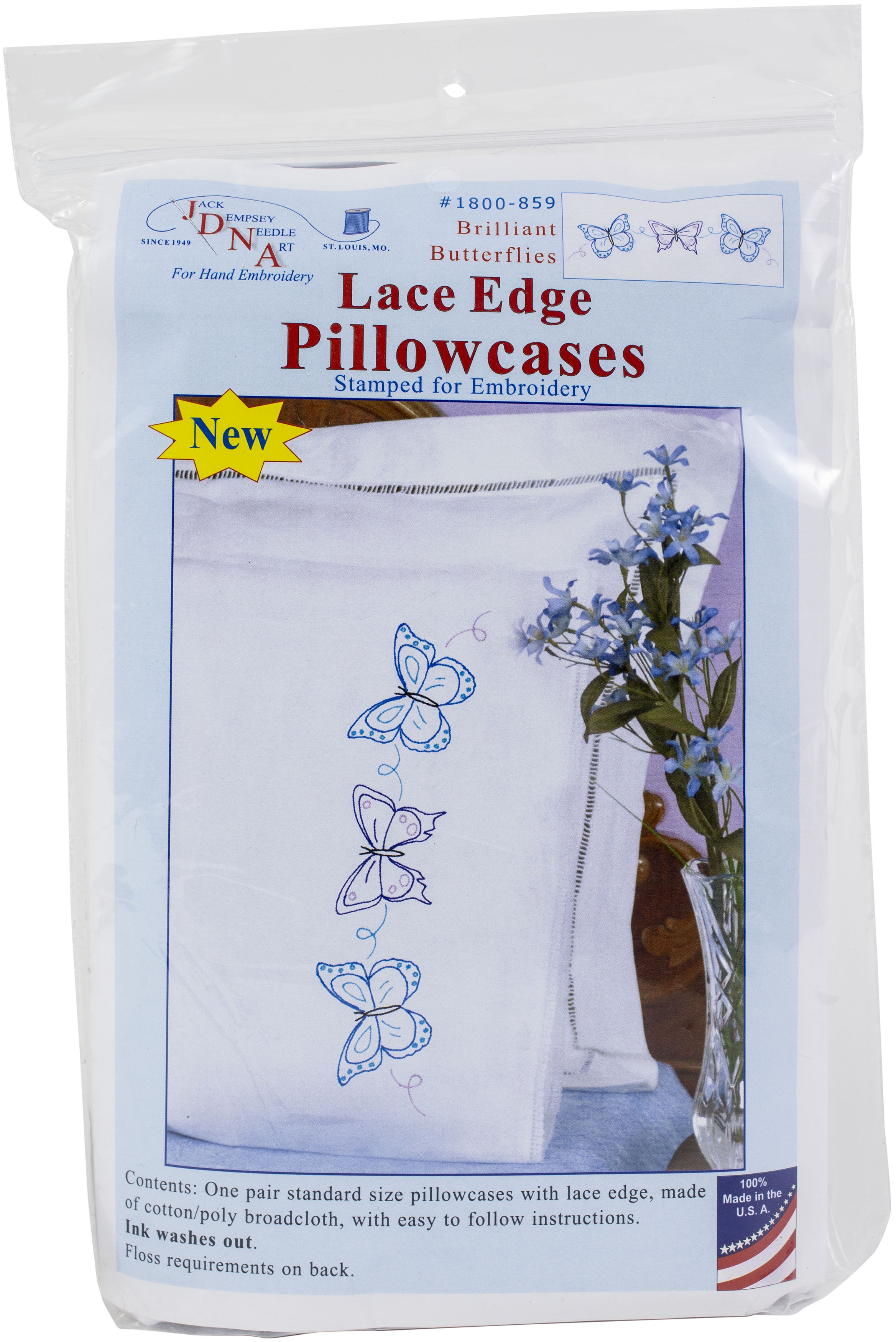Create beautiful pillowcases using this great kit. The stitching designs have been stamped using ink that washes away with any liquid and the fabric is a cotton/poly blend broadcloth. This package contains one pair of standard size pillowcases with finished lace edges, instructions for completion and care and a complete list of DMC floss requirements. Hoop, needle and floss sold separately. Design: Brilliant Butterflies. Made in USA.