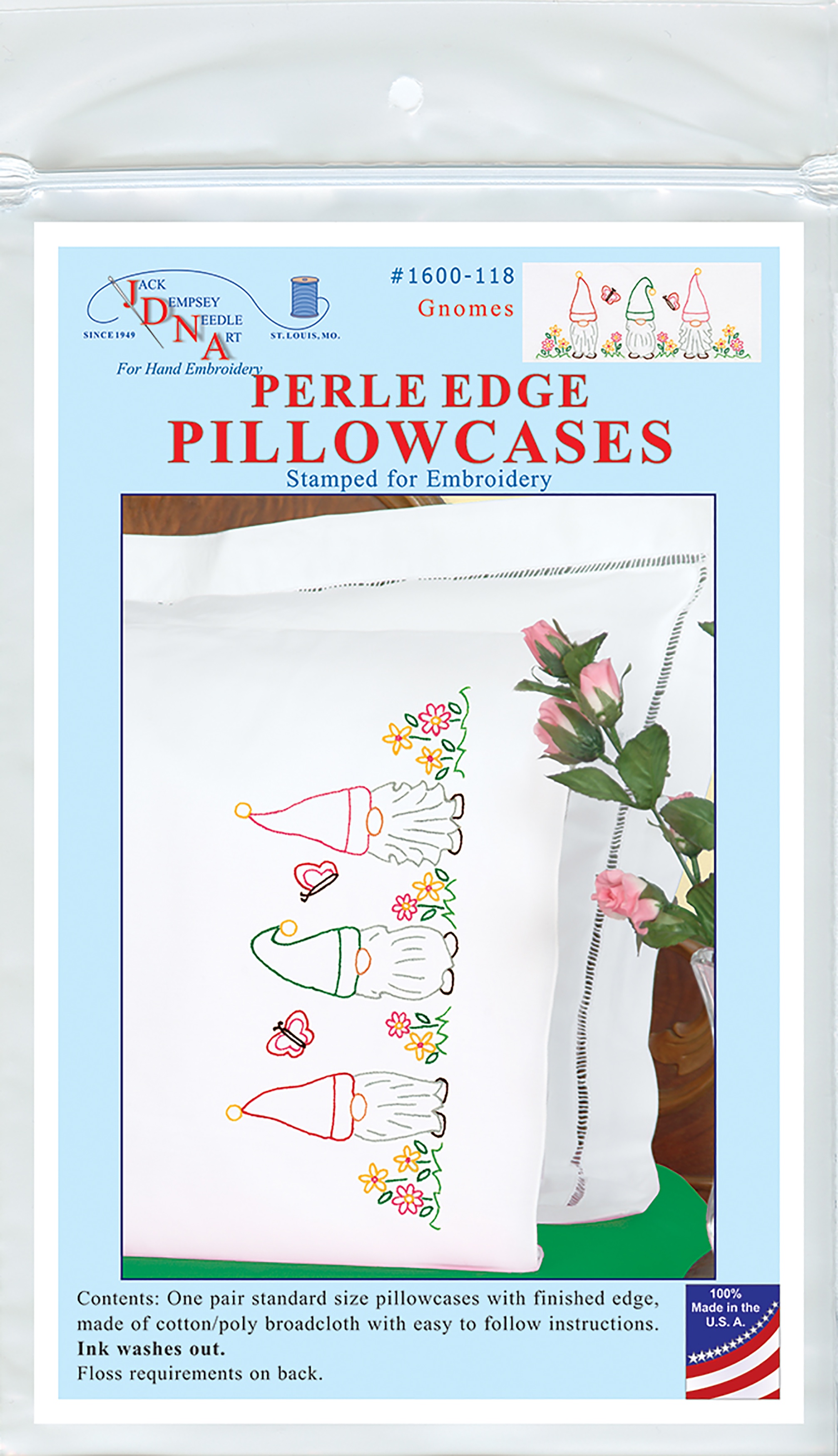 Stitch up a beautiful pair of pillowcases with this kit. Thestitching design has been stamped using ink that washes away with anyliquid and the fabric is a cotton/poly blend broadcloth. This packagecontains two standard size pillowcases, instructions for completionand care, and complete DMC floss requirements. Hoop, needle, andfloss all sold separately. Design: Gnomes. Made in USA.