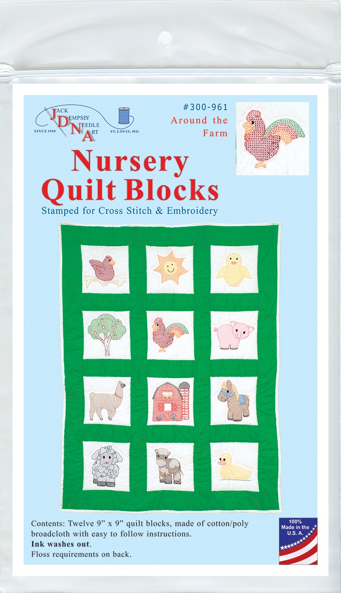 Create a beautiful quilt top using this great kit. It consists of individual squares to stitch and join together to form a quilt top. The embroidery designs have been stamped using ink that washes away with any liquid and the fabric is a cotton/poly blend broadcloth. This package contains twelve 9x9 inch quilt squares, instructions for completion and care, and complete DMC floss requirements. Fabric, backing, batting, hoop, needle, thread, and floss all sold separately. Design: Around The Farm. Made in USA.
