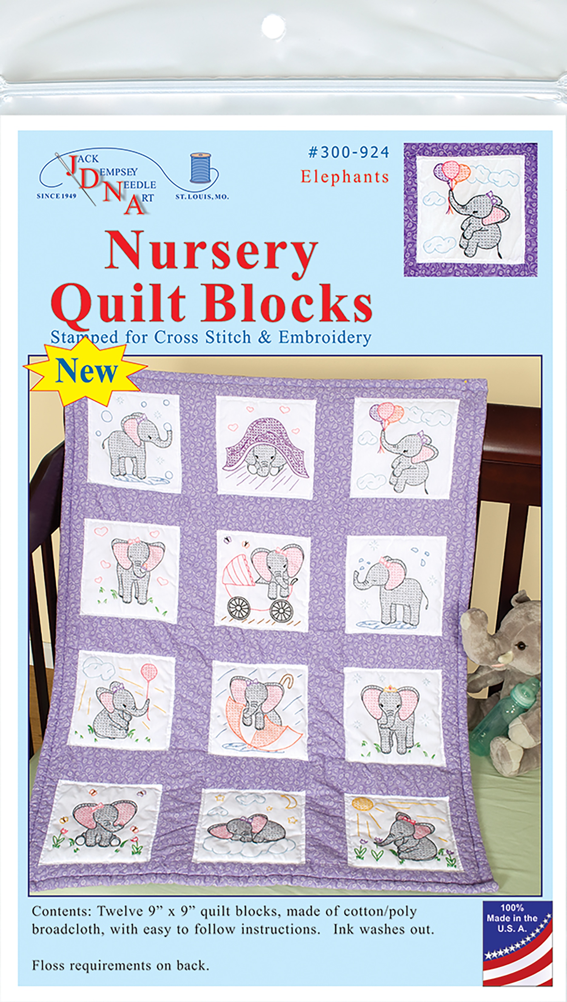 Create a beautiful quilt with these blocks! This 6.25x10 inch package contains nine inch white cotton/poly quilt blocks stamped with ink that washes out; floss requirements list and complete instructions. Additional materials needed to complete: backing, batting, hoop, needle and floss. Made in USA.